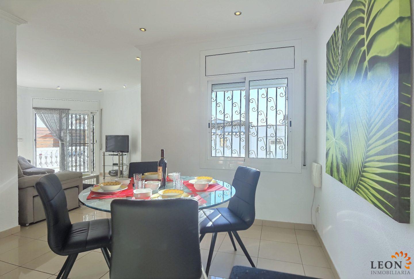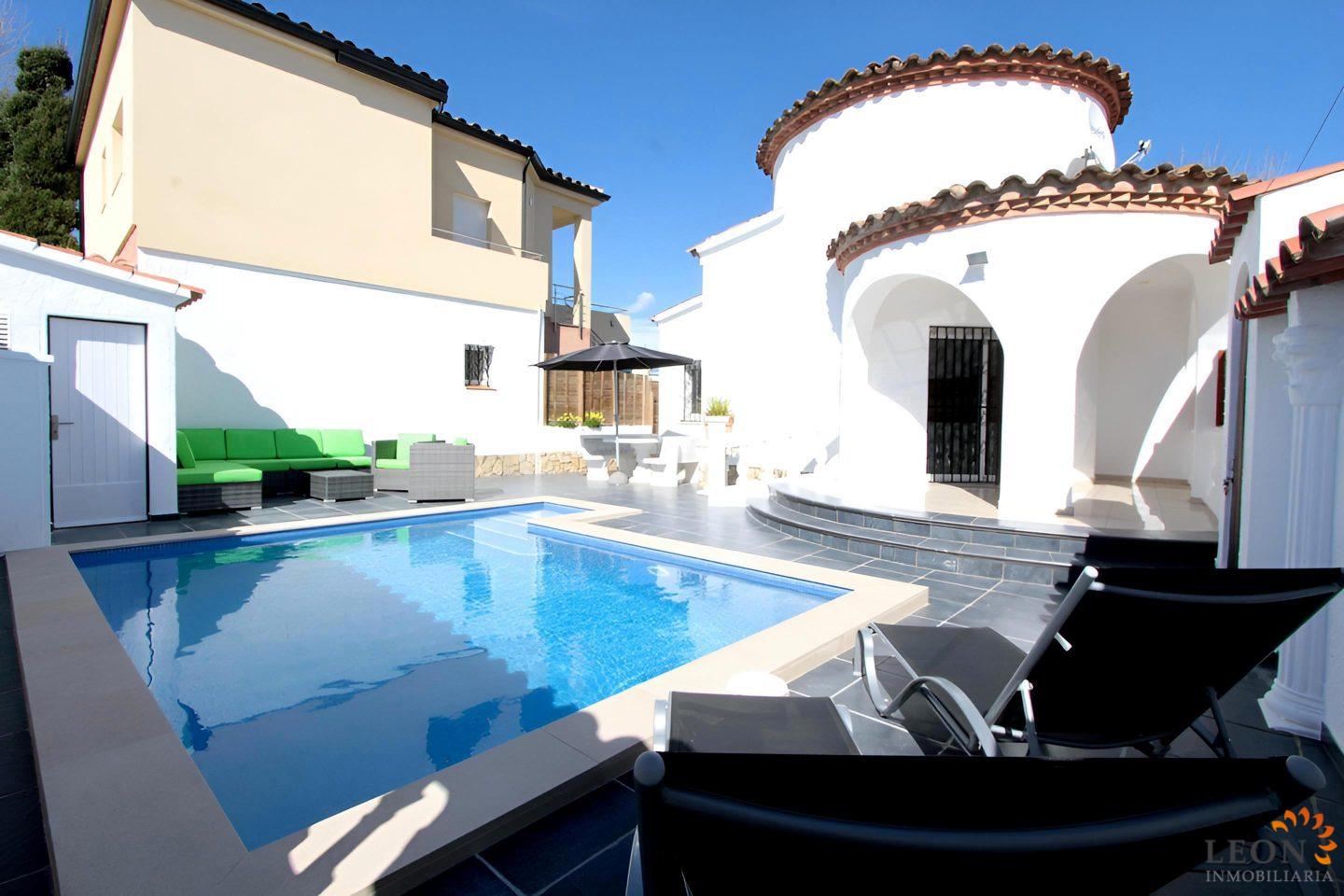 Willkommen in dieser stilvollen Villa, welche sich auf einem 239 m² großen, abgeschlossenen Grundstück befindet und hat eine Wohnfläche von 79 m², einen lichtdurchfluteten, offenen Wohn- und Essbereich mit einer voll ausgestatteten Küche (inkl. Geschirrspüler und Mikrowelle). Für ein angenehmes Klima an warmen Tagen sorgt eine Klimaanlage im Wohnbereich. Zwei gemütliche Schlafzimmer - eines davon Suite mit eigenem Bad - und ein zweites separates Badezimmer bieten genügend Platz und Privatsphäre. Der herrliche Aussenbereich mit überdachten Terrasse, die zum Entspannen einlädt. Erfrischen Sie sich im privaten Pool oder veranstalten Sie gesellige Grillabende. Zur Ausstattung gehören; Satellitenfernsehen (DE/FR/UK/NL/BE), eine Waschmaschine, elektrische Rollläden und zwei bequeme Parkplätze direkt auf dem Grundstück. Erleben Sie einen unkomplizierten Urlaub in einem Domizil, das modernen Schick und private Atmosphäre perfekt vereint. Jetzt buchen und das Leben genießen! Wegen der zentralen Lage der Villa sind Einkaufsmöglichkeiten, Restaurants und der feinen Sandstrand in wenigen Minuten zu Fuß erreichbar. Zusätzlich bieten Empuriabrava und Umgebung grenzenlose Freizeitmöglichkeiten wie Fallschirmspringen, alle Arten von Wassersportaktivitäten und Golf, als auch eine reiche Auswahl von kulturellen Attraktionen. Für weitere Informationen zum Objekt oder andere Ferienimmobilien kontaktieren Sie bitte LEON INMOBILIARIA per E-Mail oder Telefon im Hauptbüro in Empuriabrava unter: 0034 / 972 45 00 37.