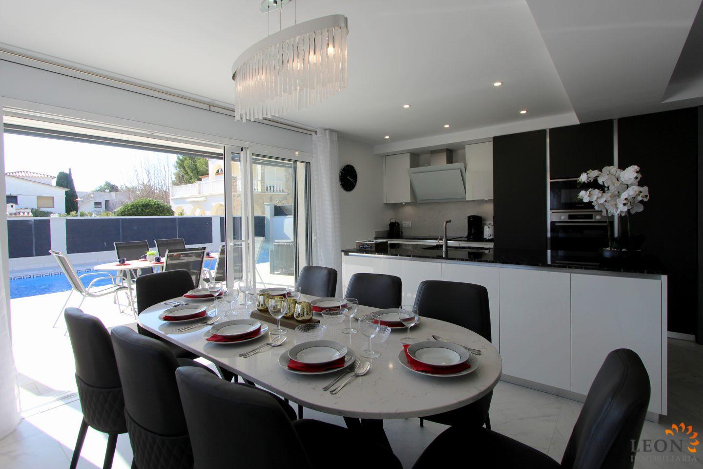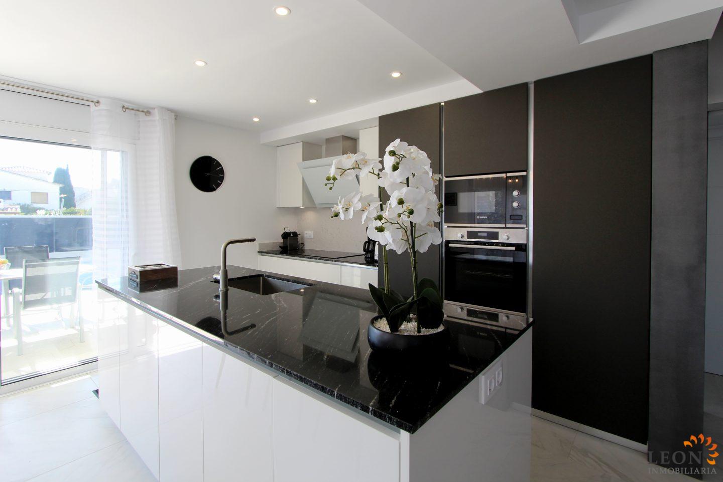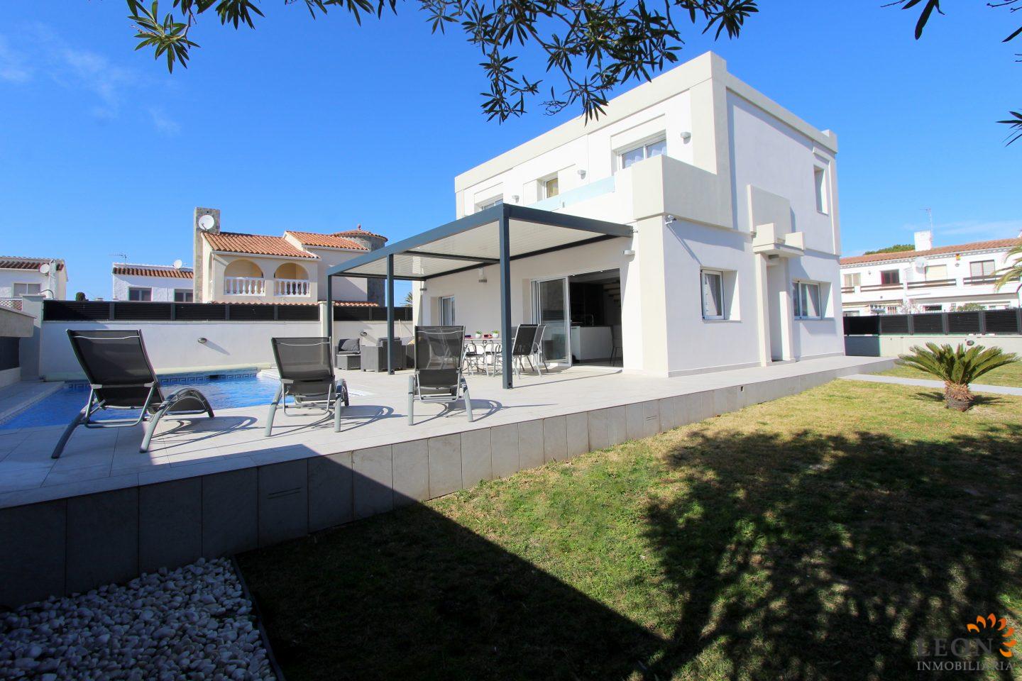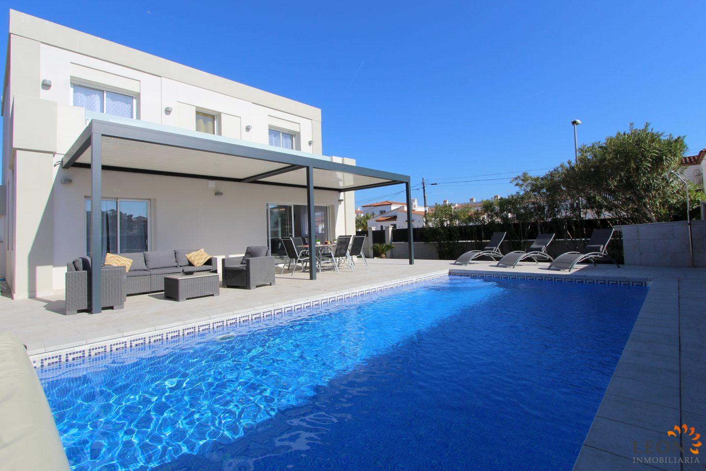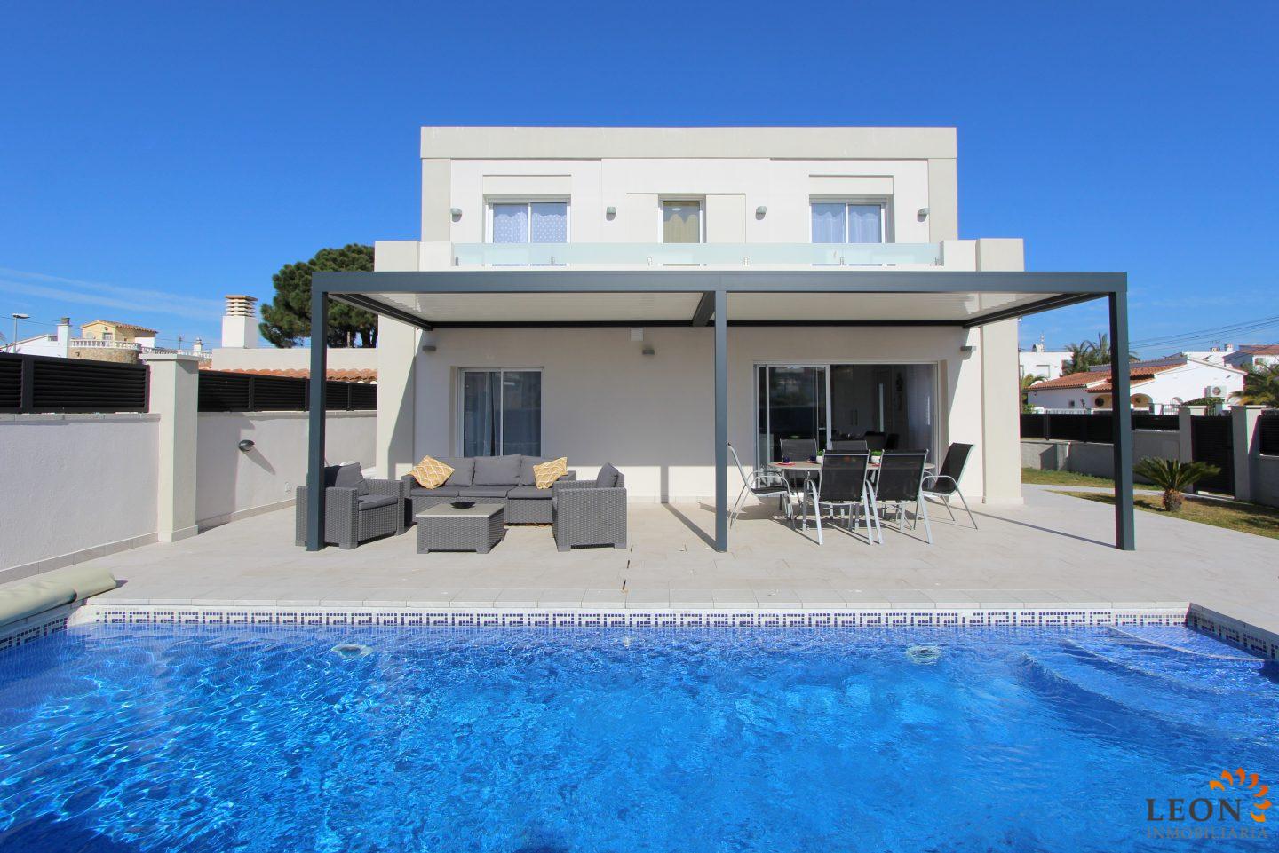 Aquesta casa moderna està situada en una zona residencial tranquil·la al centre d'Empuriabrava. La casa disposa de 4 dormitoris (3 habitacions en suite) amb un total de 4 banys, un lluminós i ampli saló-menjador i una cuina oberta totalment equipada amb accés a la magnífica terrassa, ideal per prendre el sol amb tota comoditat o gaudir de les belles hores de la tarda. Un veritable somni de vacances amb totes les comoditats com; aire condicionat, rentadora, rentavaixelles, microones, SAT-TV (UK/DE/FR/ES), calefacció central, persianes elèctriques, porta automàtica de la propietat i aparcament per a 2 cotxes. La propietat està situada al centre d'Empuriabrava, tots els serveis són a prop, la bonica platja de sorra daurada d'Empuriabrava, els restaurants, supermercats, tot a poca distància. També el centre històric de Castelló d'Empúries, Roses o els encantadors pobles de la Costa com Cadaqués amb el seu idíl·lic port són de fàcil accés amb cotxe. Empuriabrava i els seus voltants els hi ofereixen una gran selecció d'activitats d'oci com paracaigudisme, molts esports nàutics i diversos llocs de gran interès cultural com el museu Dalí de Figueres, el monestir de Sant Pere de Rodes i les ruïnes gregues d'Empúries. Per obtenir més informació sobre aquesta propietat o sobre altres immobles de vacances, els hi preguem contactin LEON Inmobiliaria, per email, o per telèfon a la nostra agència central d'Empuriabrava: 0034 / 972 45 00 37.