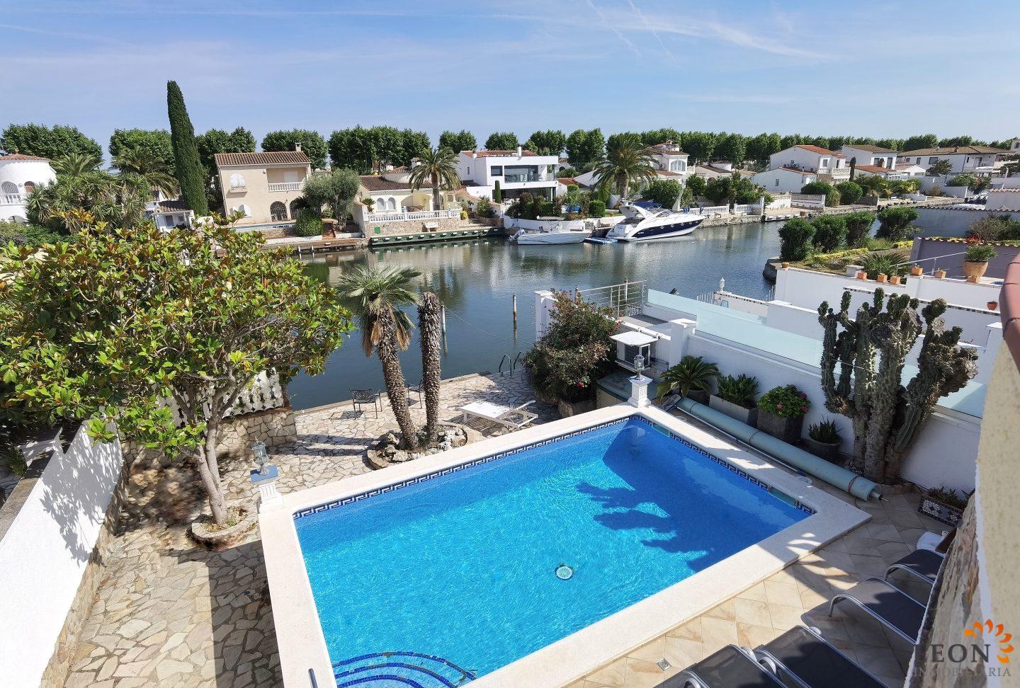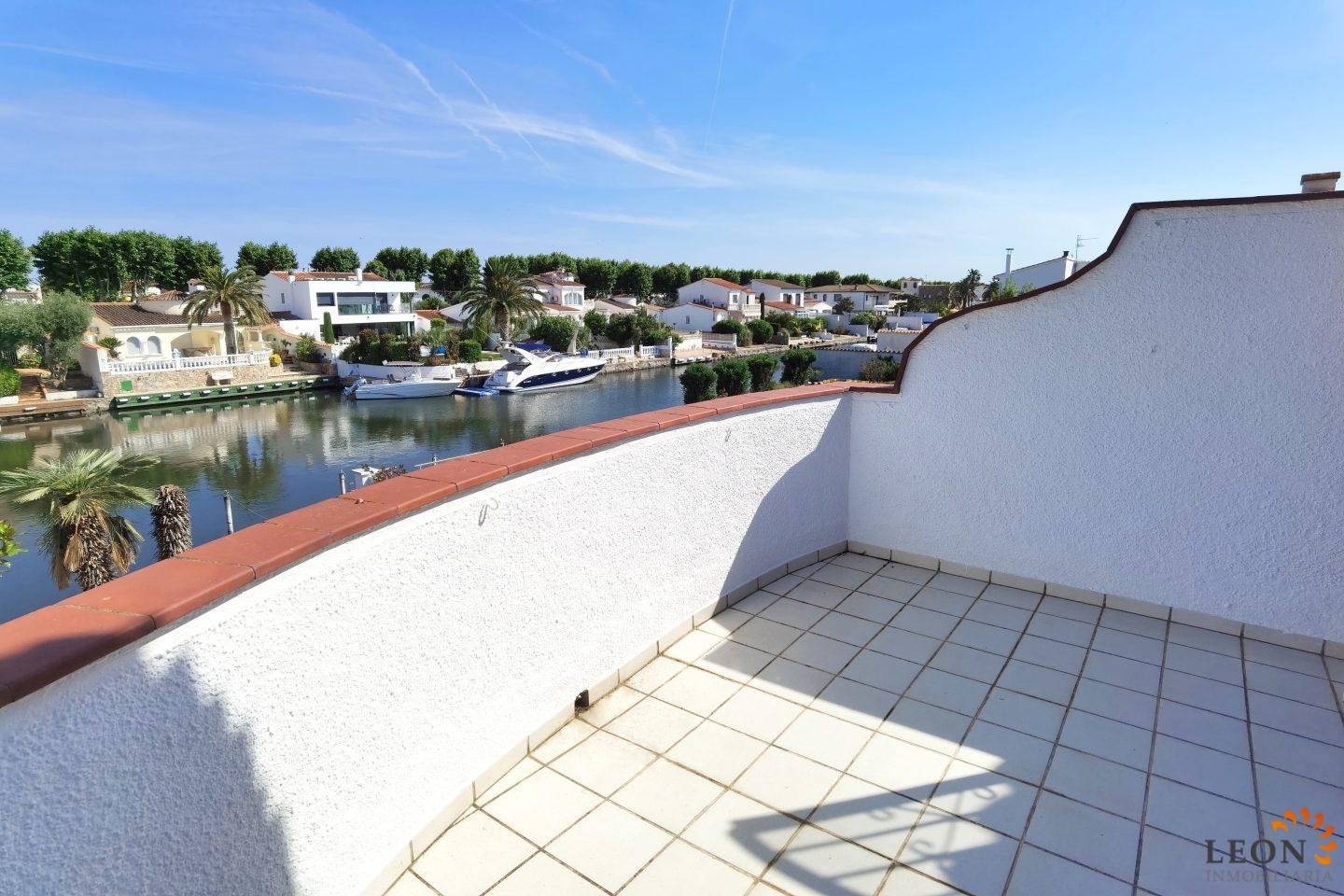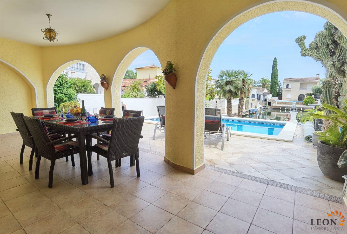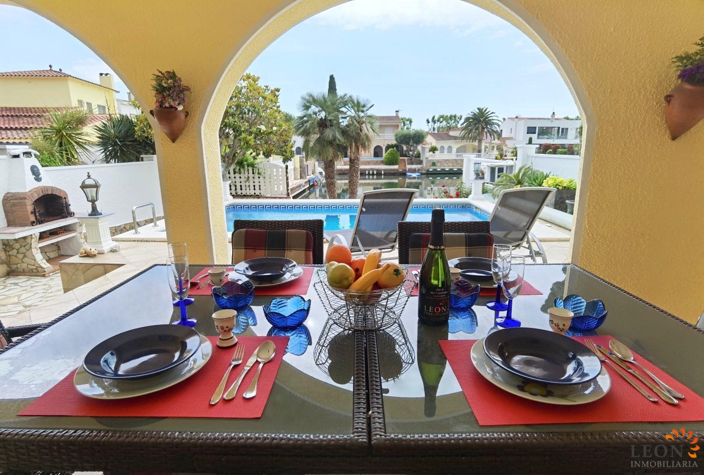 This cosy corner terraced house has a living area of 130 m2 and stands on a 354 m2 plot at the end of the canal (wide canal) with a 10 m jetty, has 3 double bedrooms (2 bedrooms on the ground floor, 1 bedroom on the 1st floor all with air conditioning), 2 bathrooms, a bright and spacious living/dining room with open, well-equipped kitchen and access to the lovely covered terrace with pool and access to the jetty. This property is equipped with: SAT-TV (DE) dishwasher, washing machine, parking in the enclosed property. Empuriabrava and its surroundings boast an excellent infrastructure. Built over 40 years ago, the complex has become a paradise for holidaymakers, water sports enthusiasts and skydivers. You can go out to sea directly from your villa and visit the beautiful bays of the Costa Brava. You'll be just a short drive from the historic centre of Castelló d'Empúries or the beautiful fishing village of Cadaqués, with its idyllic harbour and many restaurants. A wide variety of cultural activities are just half an hour's drive away, including the Dali Museum in Figueres, the ruins of Empúries and the monastery of Sant Pere de Rodes. For more information on this or other holiday rentals, please contact LEON INMOBILIARIA by email or telephone at our central agency in Empuriabrava: 0034 / 972 45 00 37.