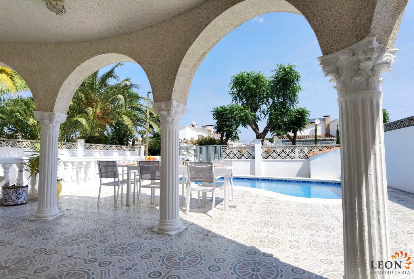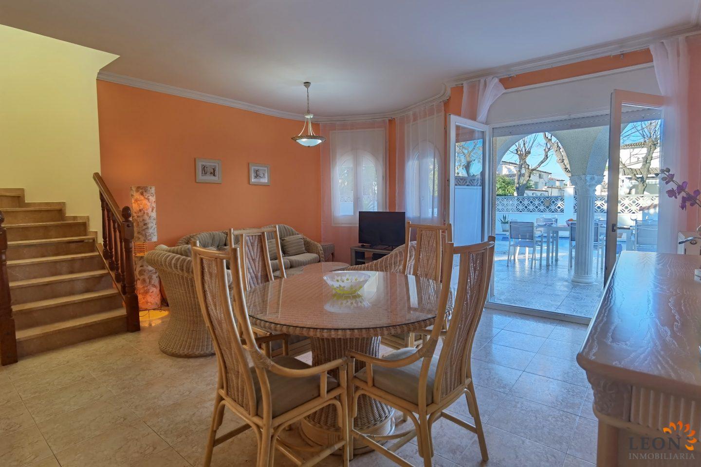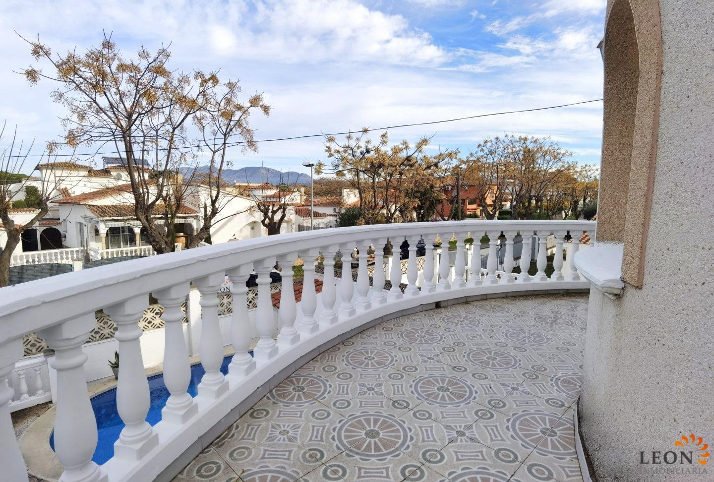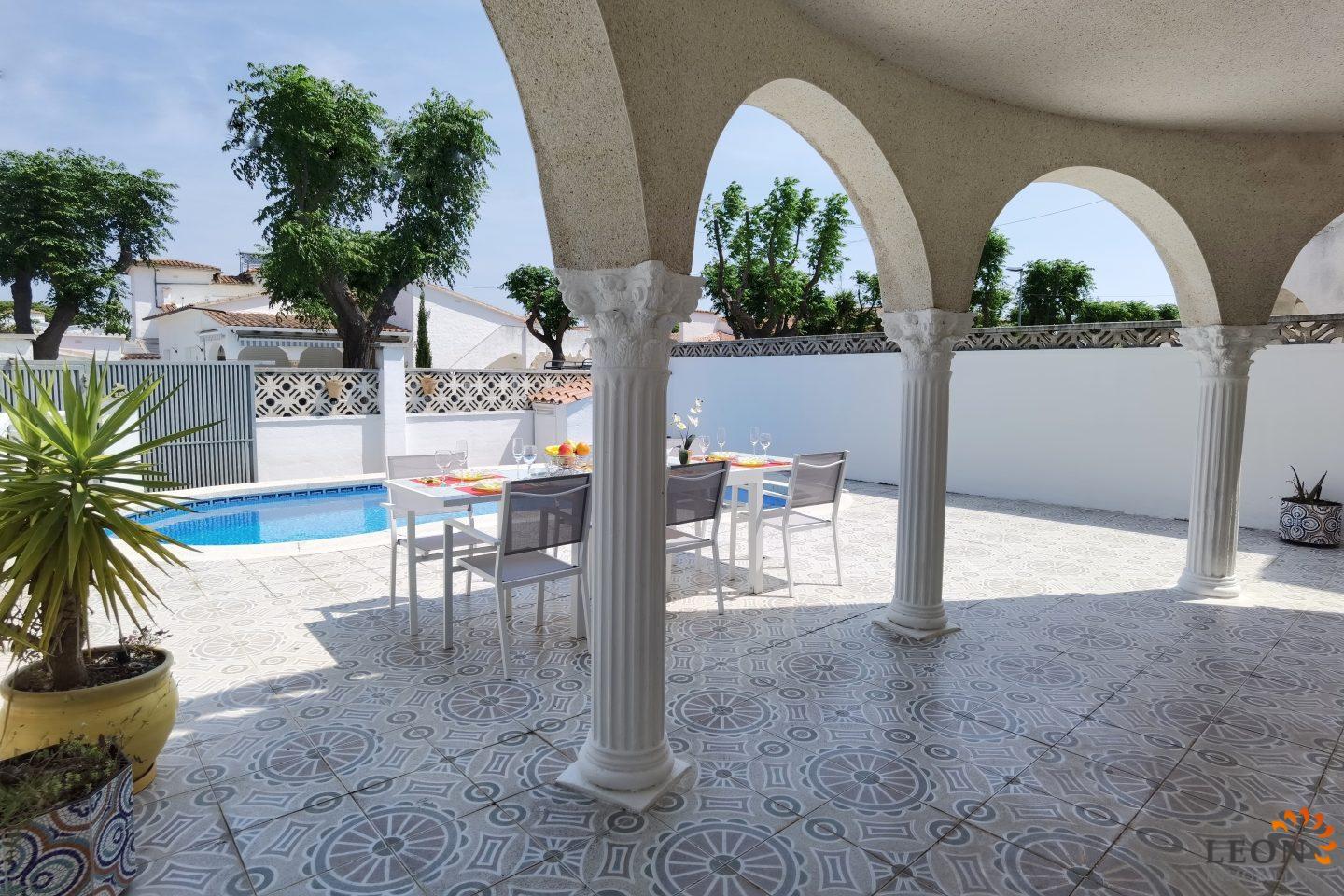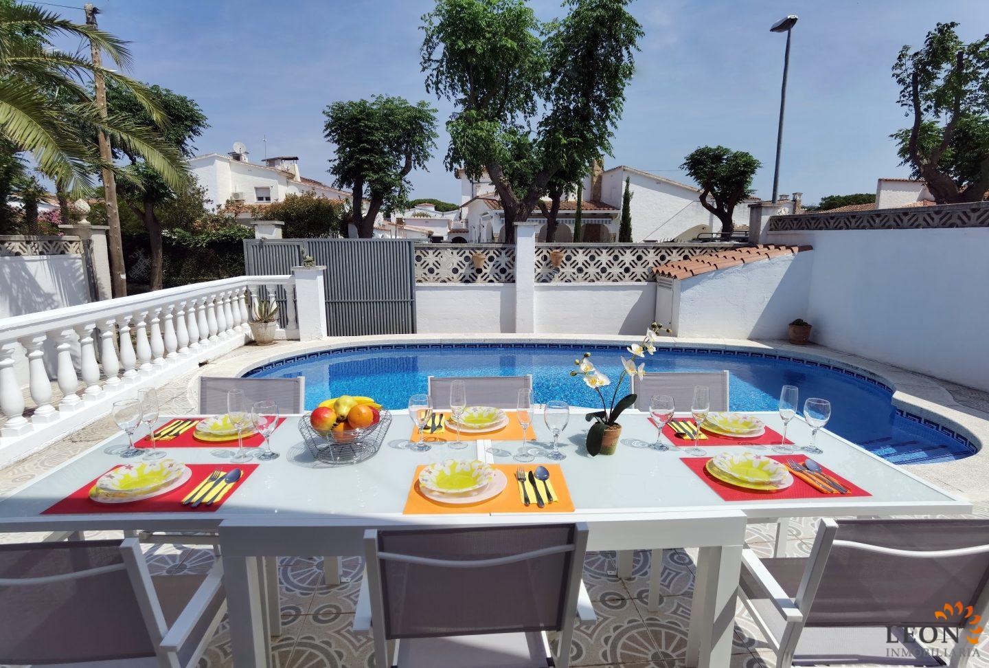 This charming holiday villa is located in a quiet residential area close to the centre of Empuriabrava. The property distributes its 191 m² of living space over two floors and stands on a 292m² plot. The ground floor consists of a bedroom with double bed, a bathroom with shower, a fully equipped kitchen and a bright, cosy living/dining room, which allows direct access to the lovely terrace with pool. A pretty stone staircase leads to the first floor, which consists of three bedrooms (two with double bed, one with two loft beds) and a bathroom with shower and bathtub. In addition, one of the two double bedrooms and the room with two loft beds, have direct access to the large balcony with a view of the beautiful mountains and the pool. Outside, there is a covered terrace with a large pool, perfect for relaxing and sunbathing, a garage converted into a laundry room and several parking spaces. The elegant arches of the villa and the traditional tiles on the balcony and terrace reflect the typical style of Empuriabrava. In addition, the villa has air conditioning, satellite TV, WIFI, a dishwasher, a washing machine and roller shutters. The central location of the holiday villa in Empuriabrava offers relatively short distances to local amenities, its lively centre and the fine sandy beach along the Mediterranean coast. Empuriabrava and its surroundings offer limitless leisure opportunities such as skydiving, all kinds of water sports activities and golf courses, as well as a rich selection of cultural attractions such as the Dali Museum in Figueres, the ruins of Ampurias and the monastery of Sant Pere de Rodes. For more information about the property or other holiday properties, please contact LEON INMOBILIARIA by email or telephone at the main office in Empuriabrava on: 0034 / 972 45 00 37.
