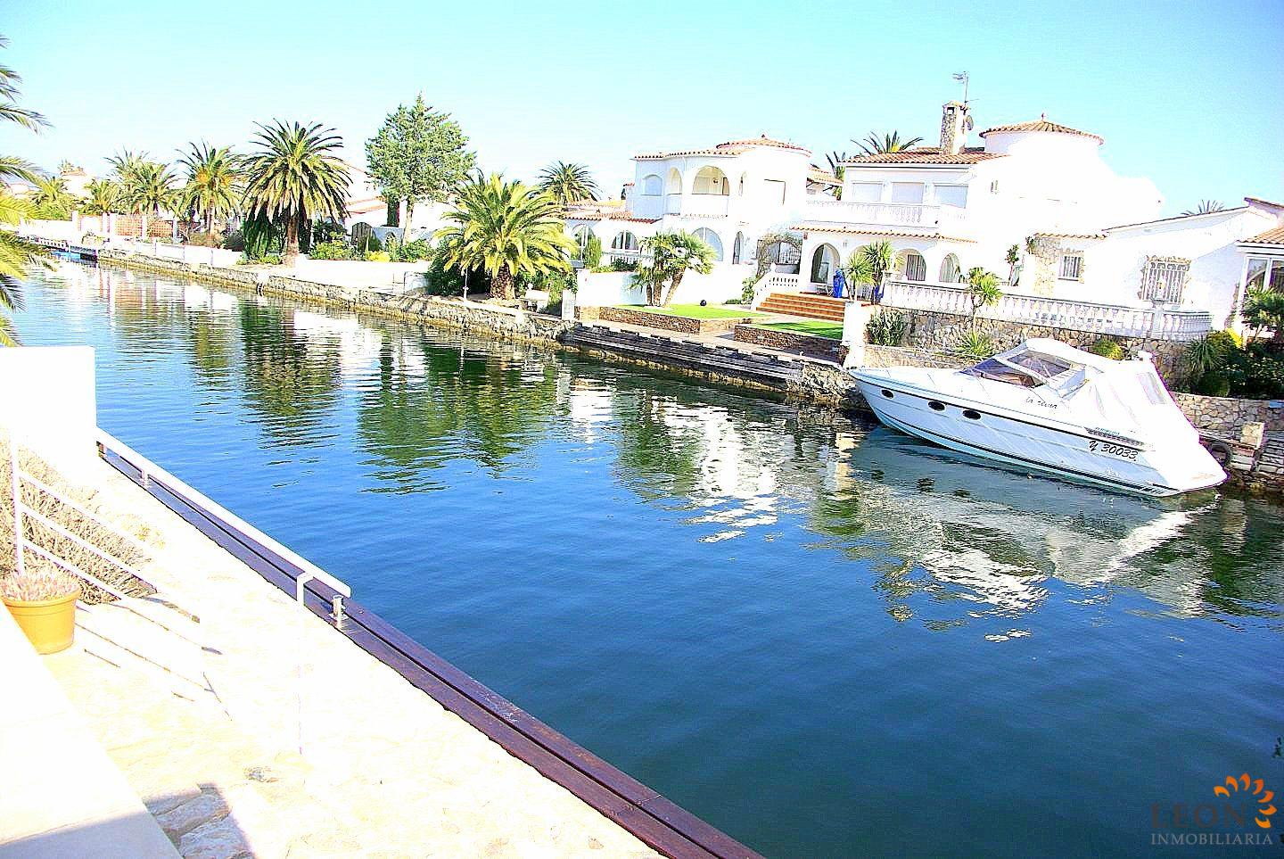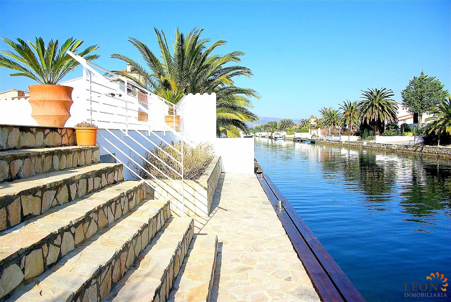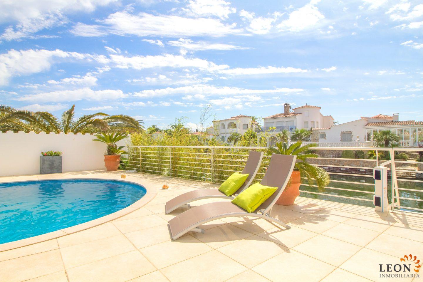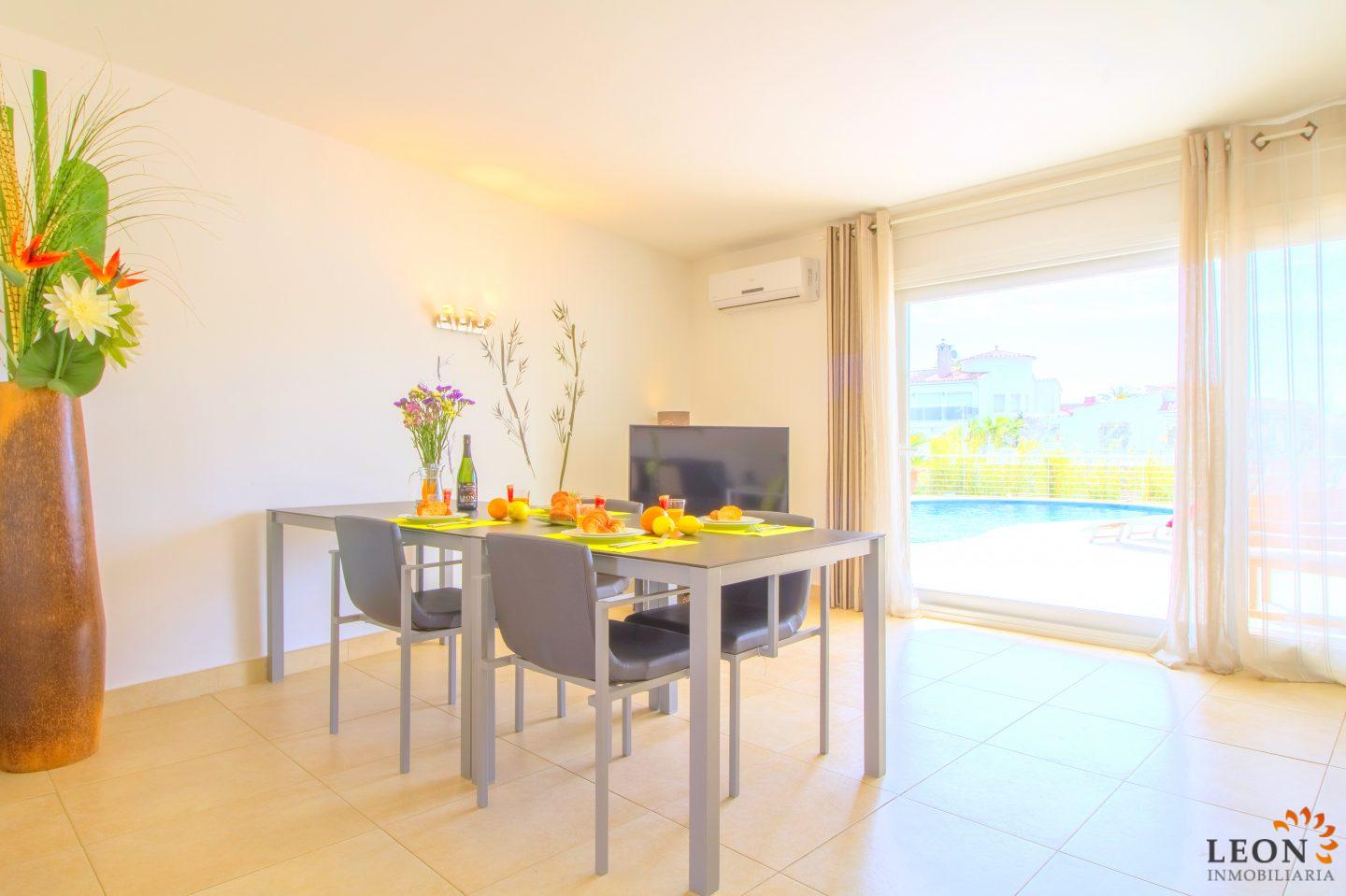 This modern villa has a living area of 125 m² spread over 2 floors. The living space consists of a spacious open plan living area with reversible air conditioning (hot/cold air), a fully equipped American style kitchen, 3 bedrooms (1 ensuite) all with reversible air conditioning, 2 bathrooms (1 with bath) and a guest toilet. The outdoor area offers a large terrace with barbecue, swimming pool and a magnificent view to the canal, jetty of 13m (wide canal), SAT-TV (DE/UK/FR/ES), washing machine, private parking in the enclosed property. Empuriabrava has the largest marina in Europe with over 25 kilometers of navigable canals and about 5,000 moorings. In addition, Ampuriabrava is considered "Eldorado" paratroopers. In this European parachuting center you can also dare with tandem jumps throughout the year. The beach of Ampúriabrava is about 1.6 km long, is slightly inclined, light, with fine sand and one of the widest of the Costa Brava. Great for adults and children. The beautiful sandy beaches of Empuriabrava, Rosas or San Pedro Pescador invite you to take a bath. The place offers a variety of sports (diving, sailing, motorboat, yachting, surfing, kite surfing, jet skiing, water skiing, deep sea fishing, fishing, bowling, flying, parachuting, horseback riding, mini golf, tennis, go-kart track, hiking, bocce) , Next to the airfield is a flight wind tunnel where everyone can fly - from 4 years old! You will hardly find it anywhere else in Europe, it is absolutely sensational and safe. From the bar / restaurant you can also enjoy watching the flights. For further information about this property, or indeed other holiday properties, please contact LEON INMOBILIARIA by email or telephone at our main office in Empuriabrava: 0034 / 972 45 00 37.