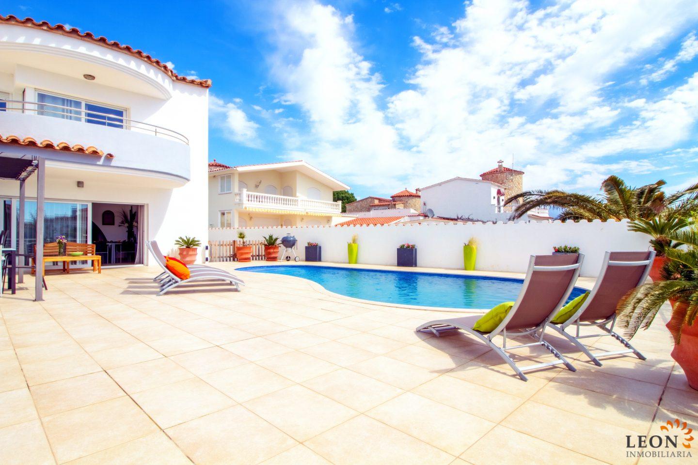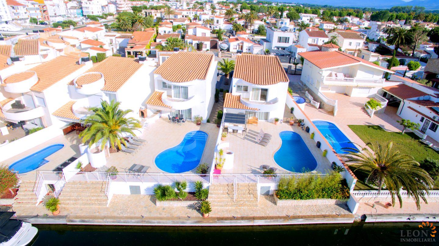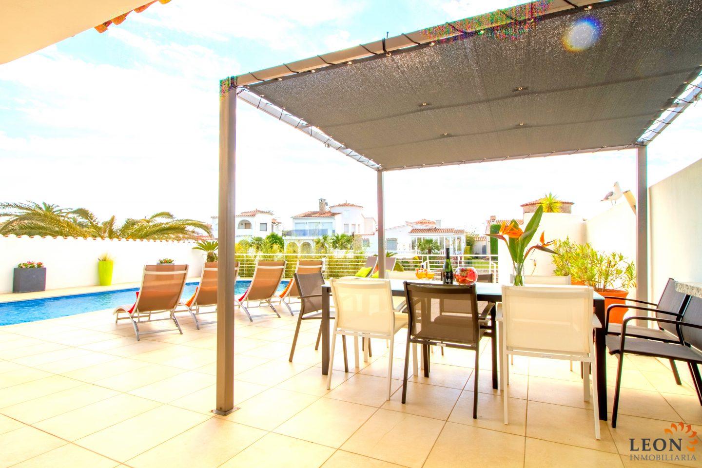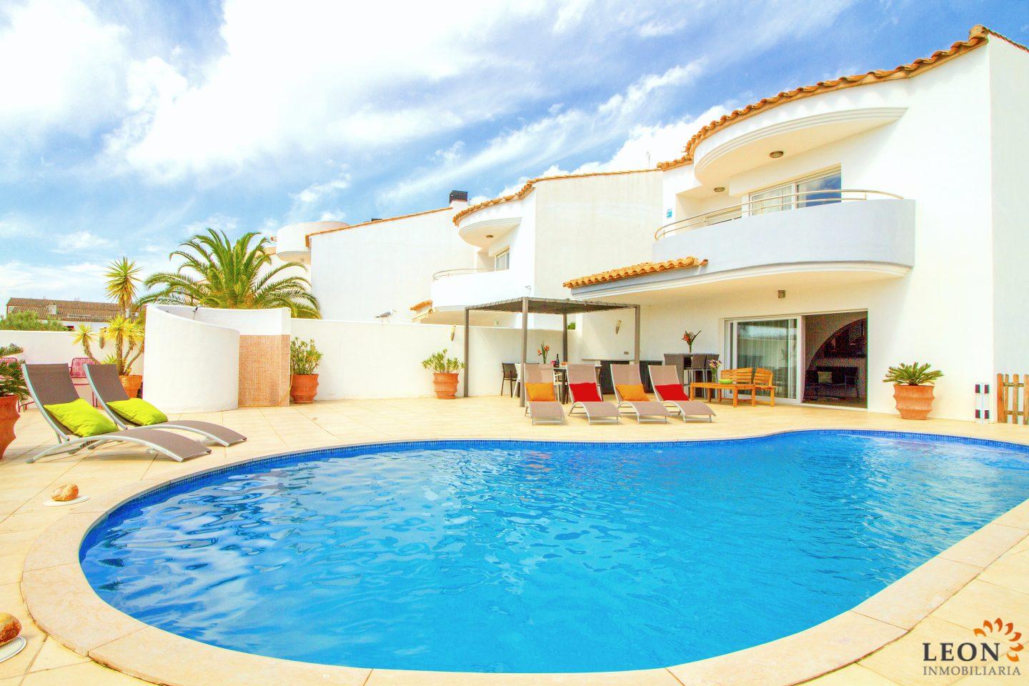 This modern villa has a living area of 125 m² spread over 2 floors. The living space consists of a spacious open plan living area with reversible air conditioning (hot/cold air), a fully equipped American style kitchen, 3 bedrooms (1 ensuite) all with reversible air conditioning, 2 bathrooms (1 with bath) and a guest toilet. The outdoor area offers a large terrace with barbecue, swimming pool and a magnificent view to the canal, jetty of 13m (wide canal), SAT-TV (DE/UK/FR/ES), washing machine, private parking in the enclosed property. Empuriabrava has the largest marina in Europe with over 25 kilometers of navigable canals and about 5,000 moorings. In addition, Ampuriabrava is considered "Eldorado" paratroopers. In this European parachuting center you can also dare with tandem jumps throughout the year. The beach of Ampúriabrava is about 1.6 km long, is slightly inclined, light, with fine sand and one of the widest of the Costa Brava. Great for adults and children. The beautiful sandy beaches of Empuriabrava, Rosas or San Pedro Pescador invite you to take a bath. The place offers a variety of sports (diving, sailing, motorboat, yachting, surfing, kite surfing, jet skiing, water skiing, deep sea fishing, fishing, bowling, flying, parachuting, horseback riding, mini golf, tennis, go-kart track, hiking, bocce) , Next to the airfield is a flight wind tunnel where everyone can fly - from 4 years old! You will hardly find it anywhere else in Europe, it is absolutely sensational and safe. From the bar / restaurant you can also enjoy watching the flights. For further information about this property, or indeed other holiday properties, please contact LEON INMOBILIARIA by email or telephone at our main office in Empuriabrava: 0034 / 972 45 00 37.