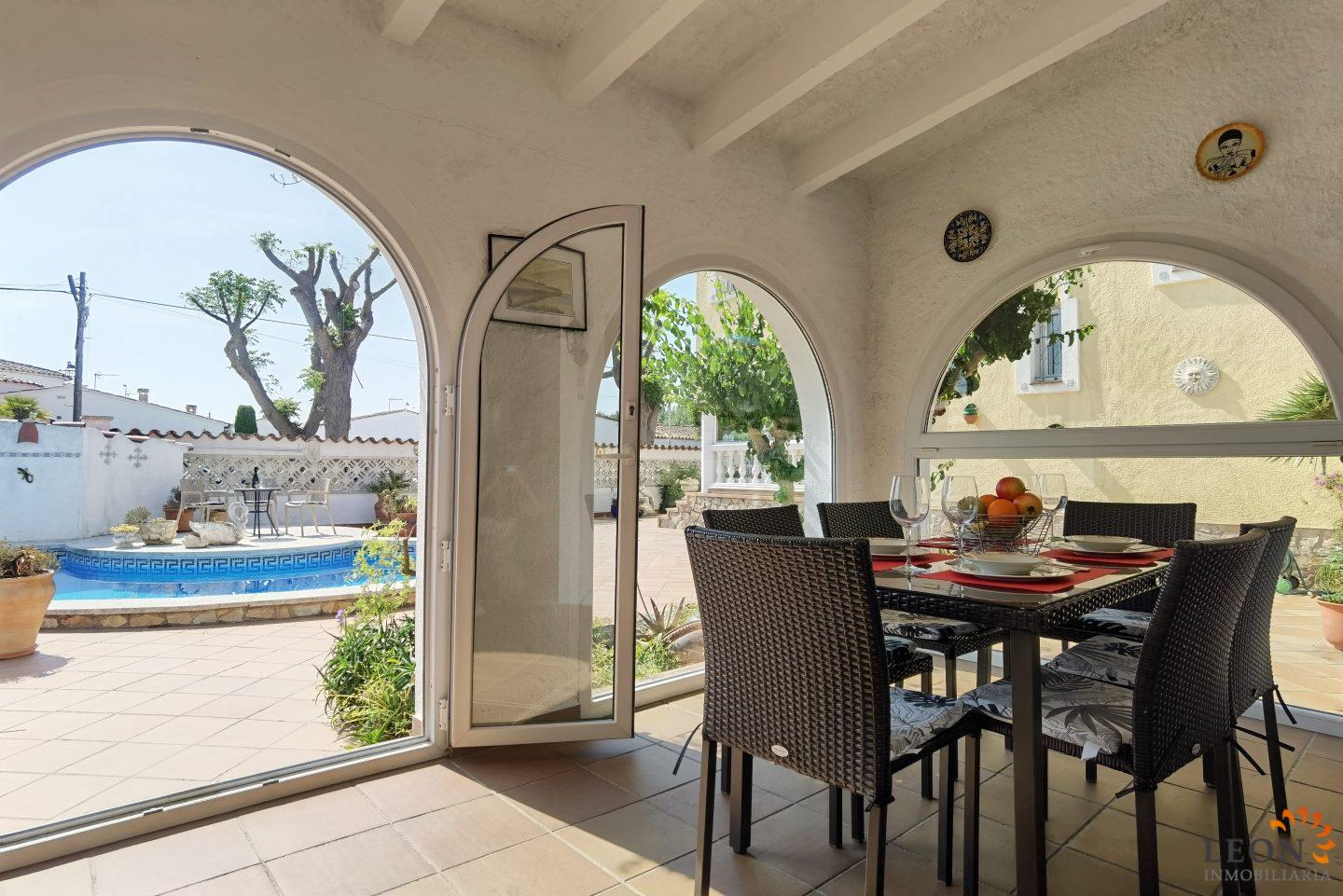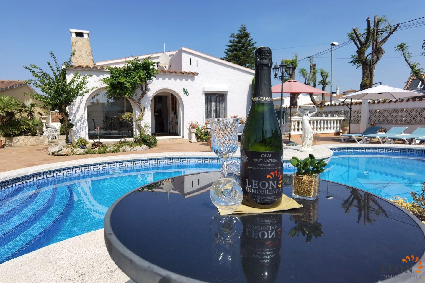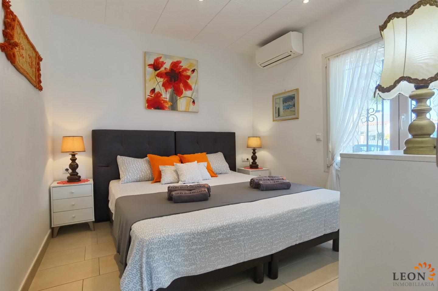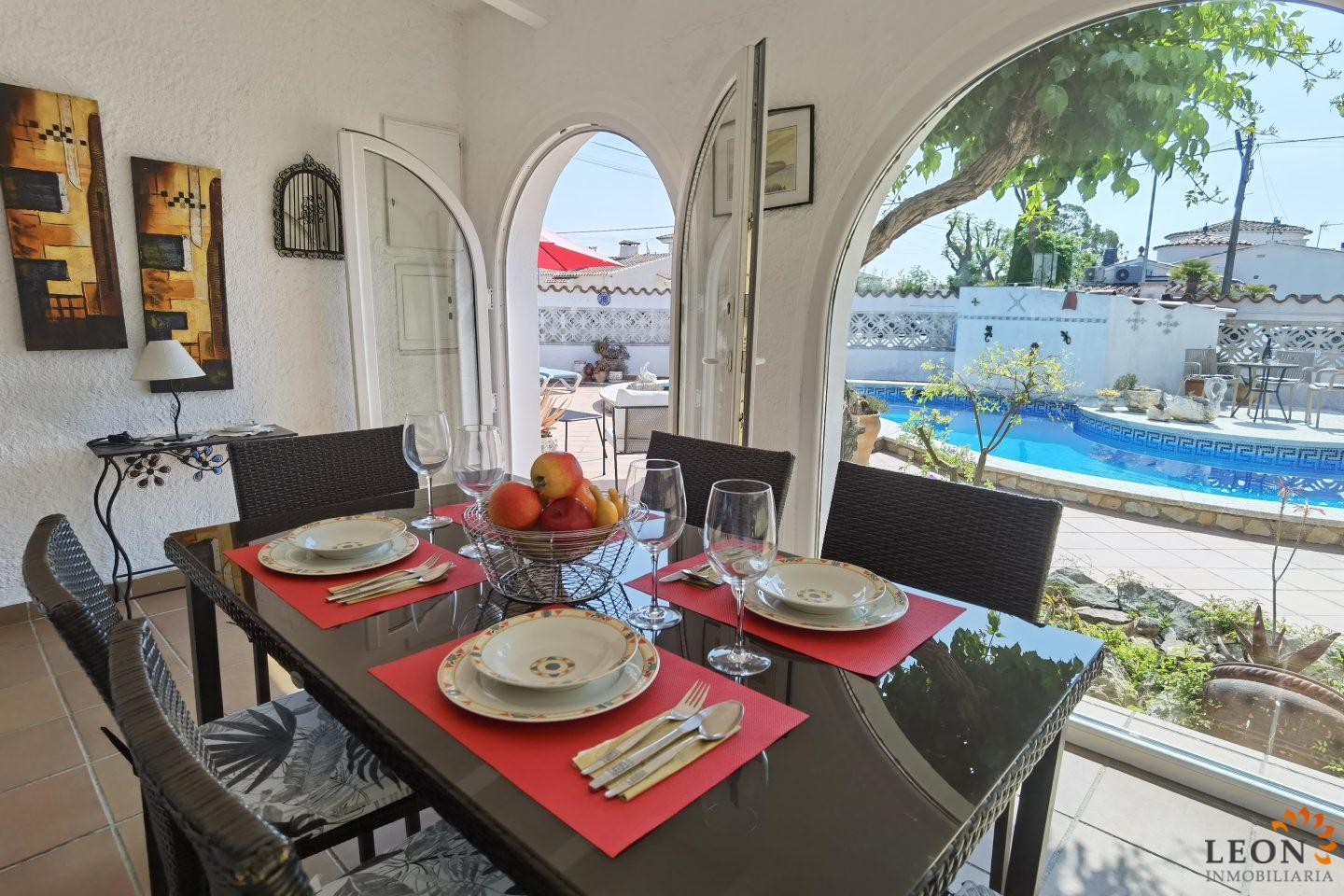 This charming house is located on a plot of 449 m² and has a living area of 64 m² with a bright living/dining room with air conditioning and open and well equipped kitchen, 2 bedrooms (1 bedroom with air conditioning) and 1 bathroom, a nice covered terrace with access to the terrace next to the private pool and parking space on the property for 1 car. This property is equipped with: Air conditioning in the living area and in one bedroom, cable/satellite TV (DE/ES), dishwasher, washing machine, barbecue, shutters, microwave, etc.. Empuriabrava has the largest marina in Europe with over 25 kilometers of navigable canals and about 5,000 moorings. In addition, Ampuriabrava is considered "Eldorado" paratroopers. In this European parachuting center you can also dare with tandem jumps throughout the year. The beach of Ampúriabrava is about 1.6 km long, is slightly inclined, light, with fine sand and one of the widest of the Costa Brava. Great for adults and children. The beautiful sandy beaches of Empuriabrava, Rosas or San Pedro Pescador invite you to take a bath. The place offers a variety of sports (diving, sailing, motorboat, yachting, surfing, kite surfing, jet skiing, water skiing, deep sea fishing, fishing, bowling, flying, parachuting, horseback riding, mini golf, tennis, go-kart track, hiking, bocce) , Next to the airfield is a flight wind tunnel where everyone can fly - from 4 years old! You will hardly find it anywhere else in Europe, it is absolutely sensational and safe. From the bar / restaurant you can also enjoy watching the flights. For further information about this property, or indeed other holiday properties, please contact LEON INMOBILIARIA by email or telephone at our main office in Empuriabrava: 0034 / 972 45 00 37.