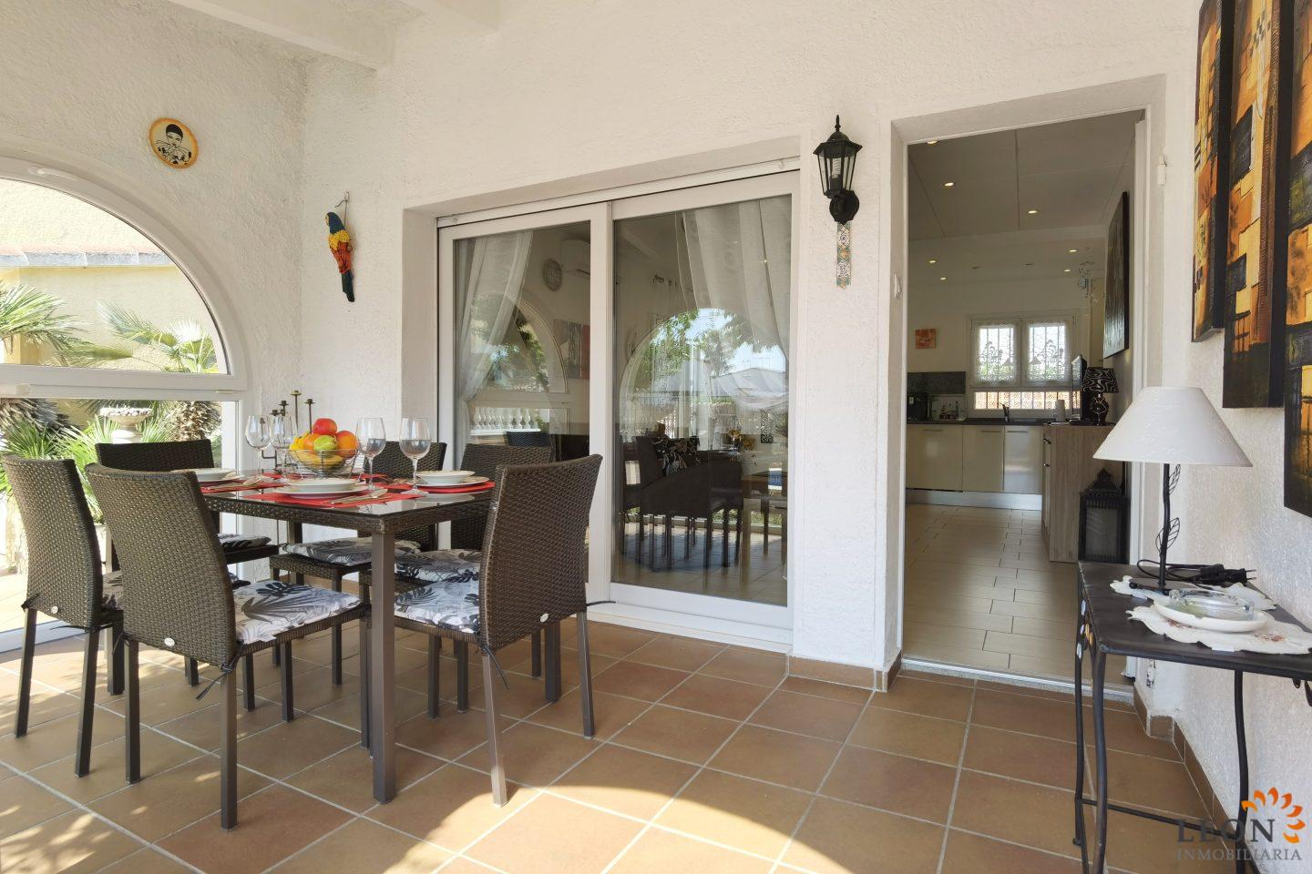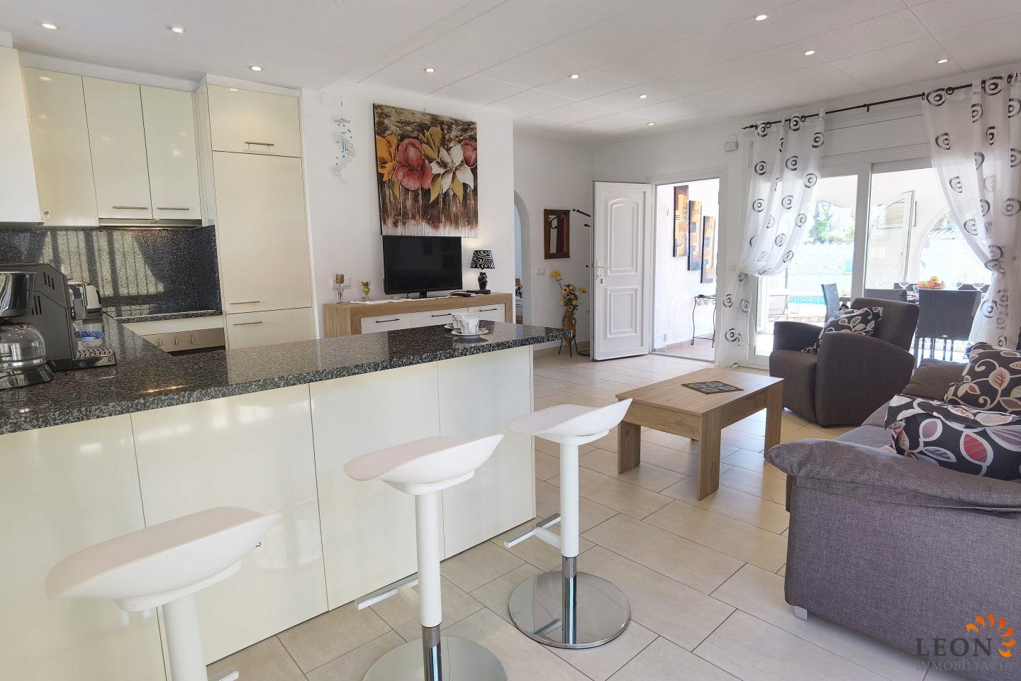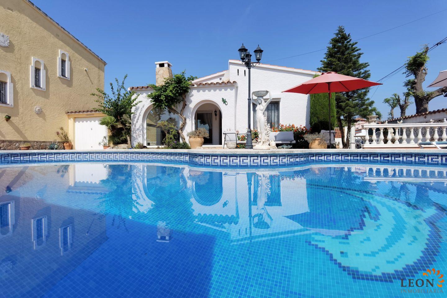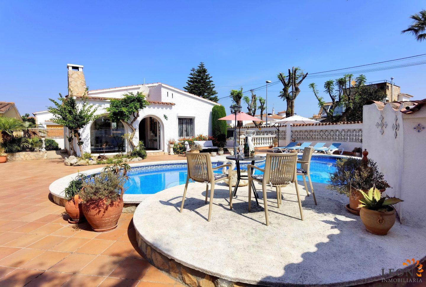 This charming house is located on a plot of 449 m² and has a living area of 64 m² with a bright living/dining room with air conditioning and open and well equipped kitchen, 2 bedrooms (1 bedroom with air conditioning) and 1 bathroom, a nice covered terrace with access to the terrace next to the private pool and parking space on the property for 1 car. This property is equipped with: Air conditioning in the living area and in one bedroom, cable/satellite TV (DE/ES), dishwasher, washing machine, barbecue, shutters, microwave, etc.. Empuriabrava has the largest marina in Europe with over 25 kilometers of navigable canals and about 5,000 moorings. In addition, Ampuriabrava is considered "Eldorado" paratroopers. In this European parachuting center you can also dare with tandem jumps throughout the year. The beach of Ampúriabrava is about 1.6 km long, is slightly inclined, light, with fine sand and one of the widest of the Costa Brava. Great for adults and children. The beautiful sandy beaches of Empuriabrava, Rosas or San Pedro Pescador invite you to take a bath. The place offers a variety of sports (diving, sailing, motorboat, yachting, surfing, kite surfing, jet skiing, water skiing, deep sea fishing, fishing, bowling, flying, parachuting, horseback riding, mini golf, tennis, go-kart track, hiking, bocce) , Next to the airfield is a flight wind tunnel where everyone can fly - from 4 years old! You will hardly find it anywhere else in Europe, it is absolutely sensational and safe. From the bar / restaurant you can also enjoy watching the flights. For further information about this property, or indeed other holiday properties, please contact LEON INMOBILIARIA by email or telephone at our main office in Empuriabrava: 0034 / 972 45 00 37.