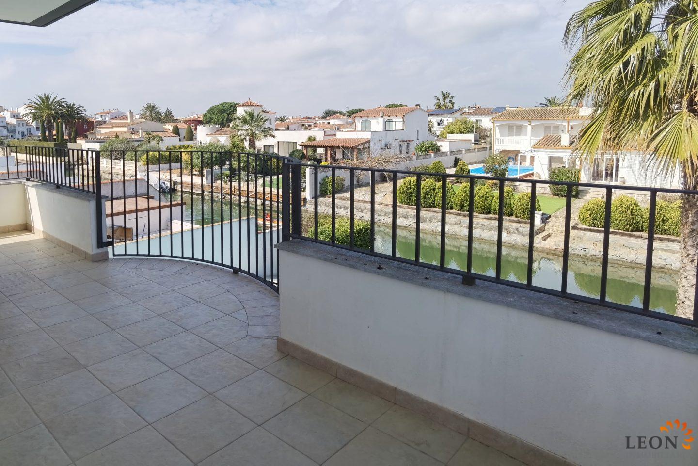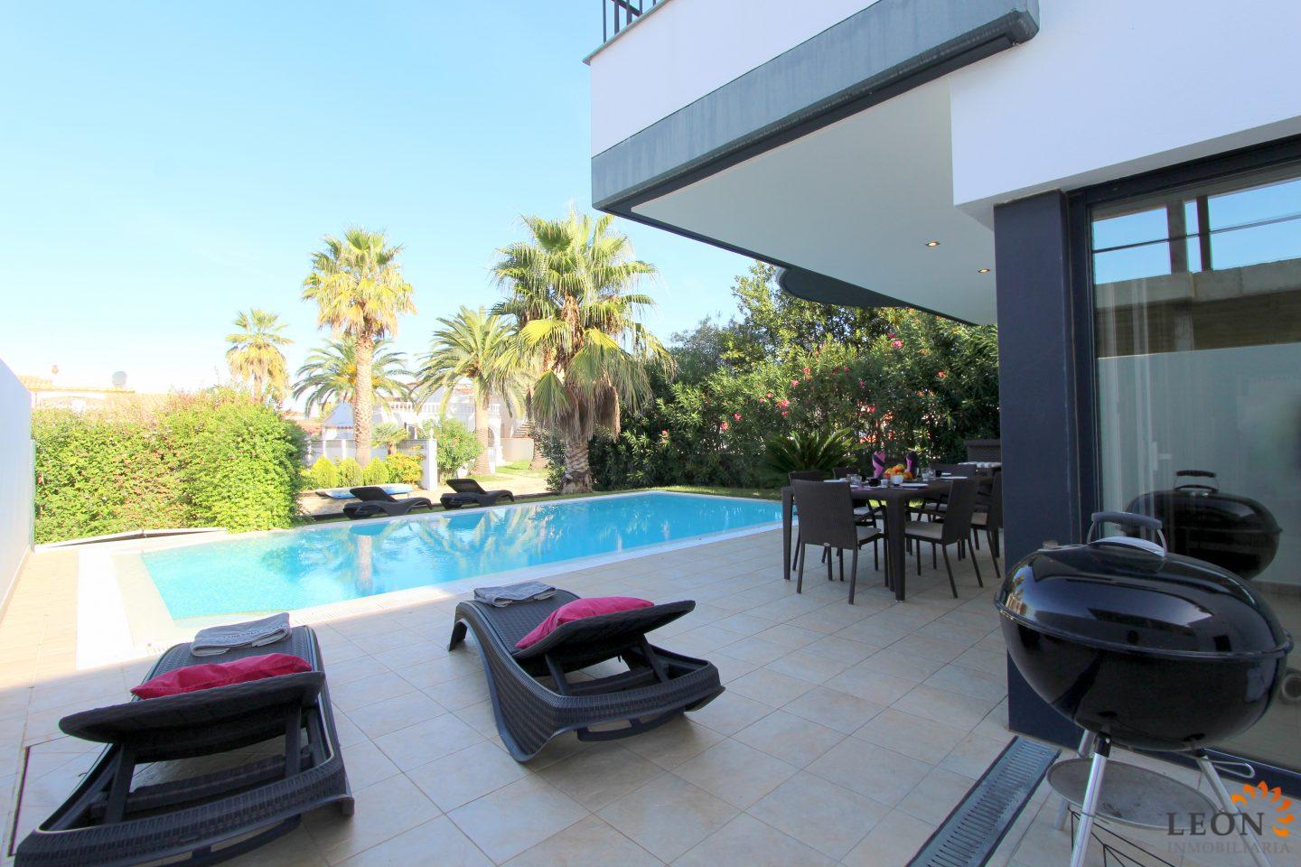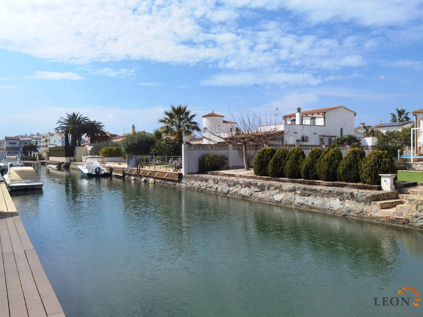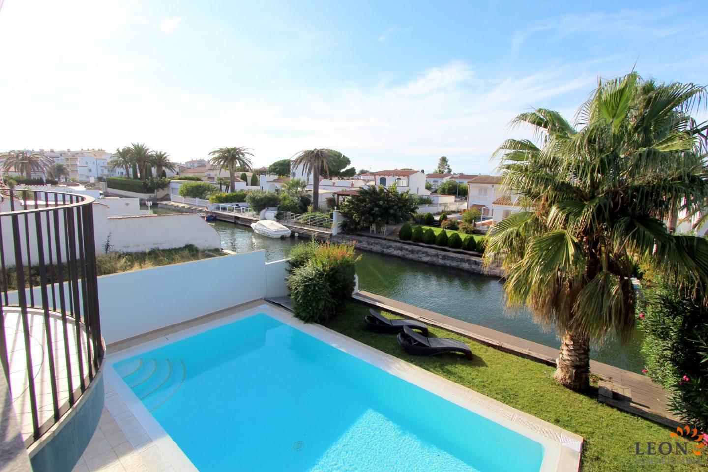 This modern and striking holiday villa near the centre of Empuriabrava is situated within a large garden on one of the canals (smal canal). Besides 4 double bedrooms and 3 bathrooms, the property boasts a spacious and light open plan living area with a fully fitted American style kitchen. The garden has a covered terrace with wonderful views over the swimming pool and canal, as well a deep 12 m long private mooring space. The views from the balcony are even more spectacular. Also worth mentioning are the barbecue, dishwasher, washing machine and cable television for extra comfort, as well as the off road private parking facility. The central location of the villa offers shops, restaurants and the sandy beach within easy walking distance. Additionally, Empuriabrava and the surrounding area offer unlimited recreational opportunities like skydiving, all kinds of water sport activities and golf, as well as a wide choice of cultural attractions such as the Dali museum in Figueres, the monastery of Sant Pere de Rodes and the Greek and Roman ruins of Ampurias. For further information about this property, or indeed other holiday properties, please contact LEON INMOBILIARIA by email or telephone at our main office in Empuriabrava: 0034 / 972 45 00 37.