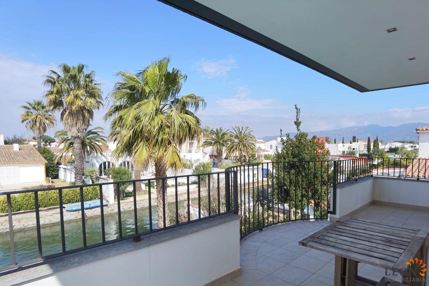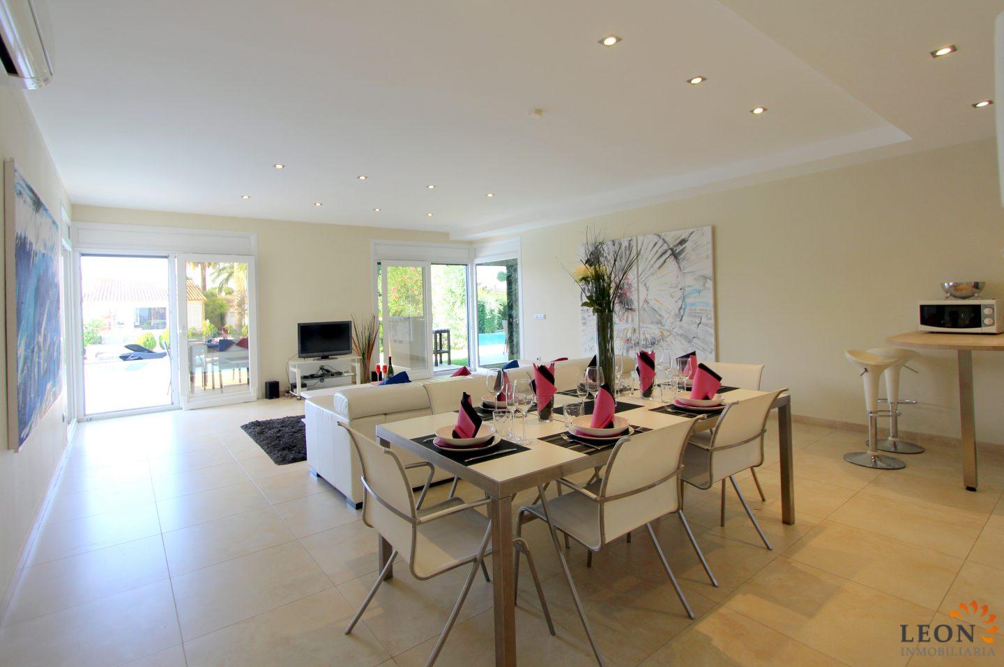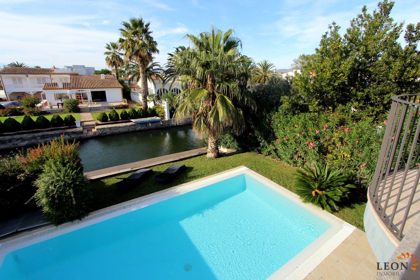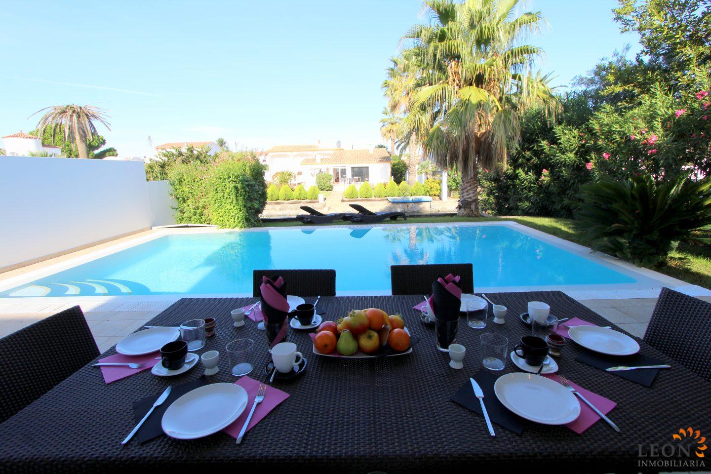 This modern and striking holiday villa near the centre of Empuriabrava is situated within a large garden on one of the canals (smal canal). Besides 4 double bedrooms and 3 bathrooms, the property boasts a spacious and light open plan living area with a fully fitted American style kitchen. The garden has a covered terrace with wonderful views over the swimming pool and canal, as well a deep 12 m long private mooring space. The views from the balcony are even more spectacular. Also worth mentioning are the barbecue, dishwasher, washing machine and cable television for extra comfort, as well as the off road private parking facility. The central location of the villa offers shops, restaurants and the sandy beach within easy walking distance. Additionally, Empuriabrava and the surrounding area offer unlimited recreational opportunities like skydiving, all kinds of water sport activities and golf, as well as a wide choice of cultural attractions such as the Dali museum in Figueres, the monastery of Sant Pere de Rodes and the Greek and Roman ruins of Ampurias. For further information about this property, or indeed other holiday properties, please contact LEON INMOBILIARIA by email or telephone at our main office in Empuriabrava: 0034 / 972 45 00 37.