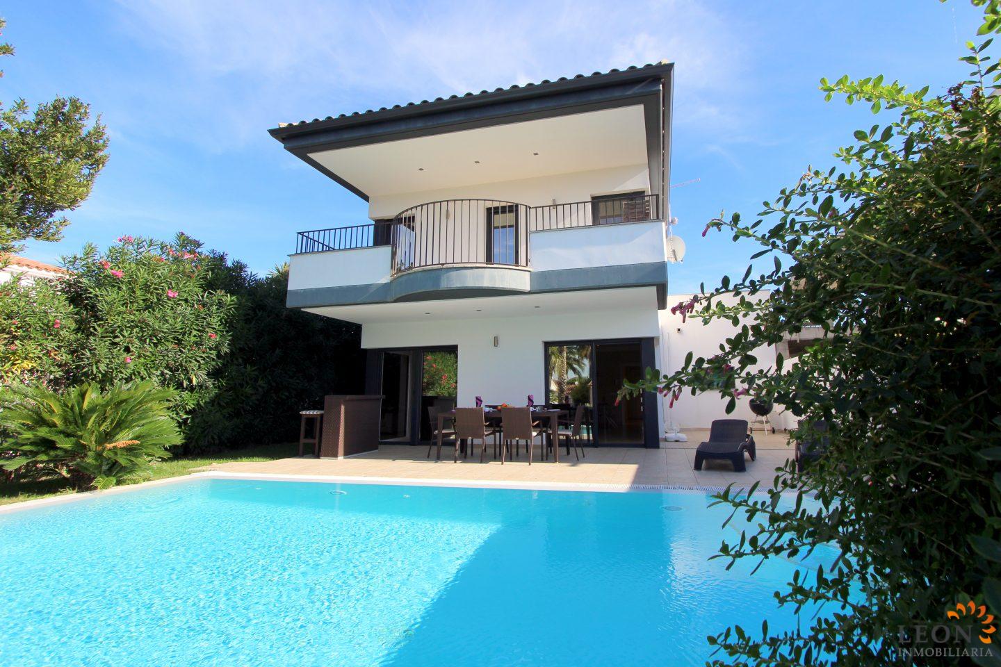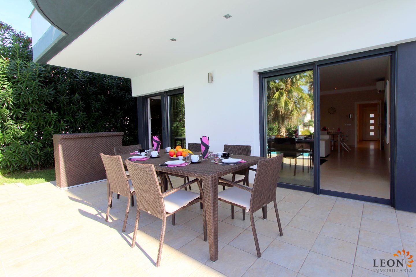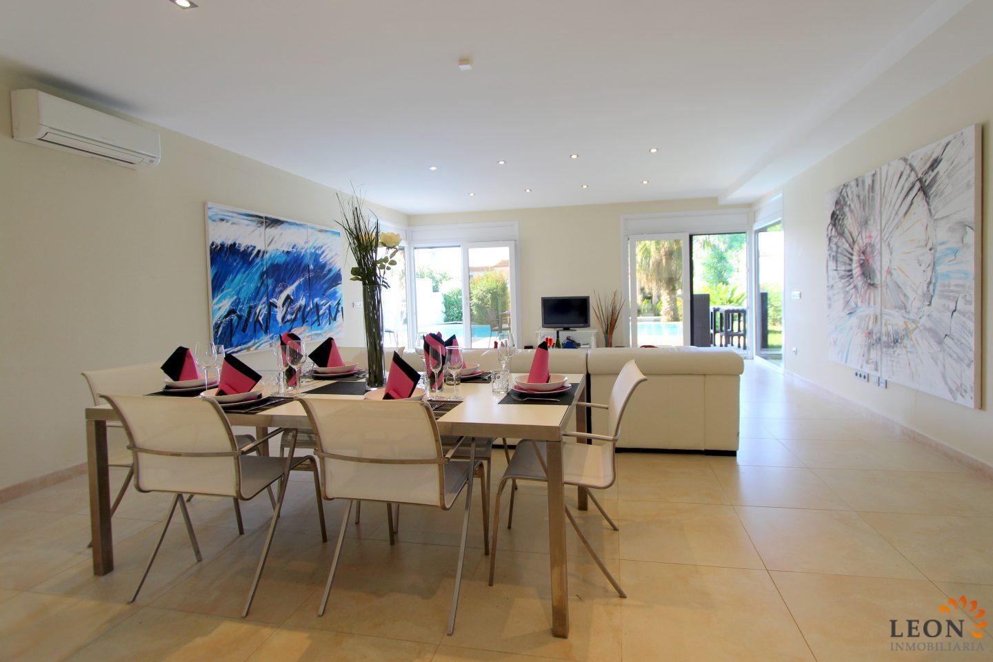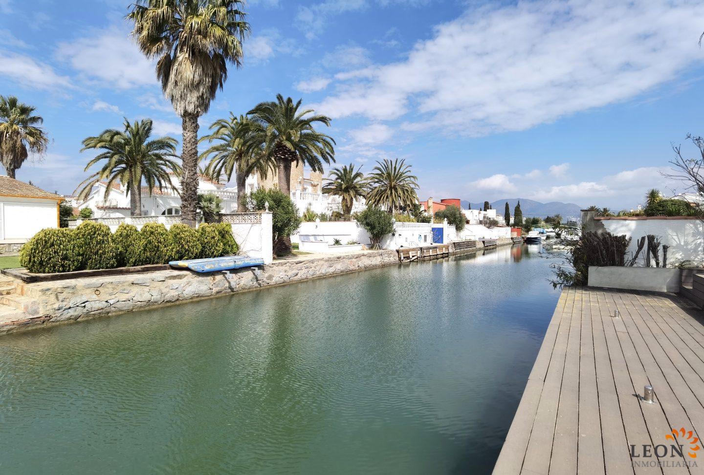 This modern and striking holiday villa near the centre of Empuriabrava is situated within a large garden on one of the canals (smal canal). Besides 4 double bedrooms and 3 bathrooms, the property boasts a spacious and light open plan living area with a fully fitted American style kitchen. The garden has a covered terrace with wonderful views over the swimming pool and canal, as well a deep 12 m long private mooring space. The views from the balcony are even more spectacular. Also worth mentioning are the barbecue, dishwasher, washing machine and cable television for extra comfort, as well as the off road private parking facility. The central location of the villa offers shops, restaurants and the sandy beach within easy walking distance. Additionally, Empuriabrava and the surrounding area offer unlimited recreational opportunities like skydiving, all kinds of water sport activities and golf, as well as a wide choice of cultural attractions such as the Dali museum in Figueres, the monastery of Sant Pere de Rodes and the Greek and Roman ruins of Ampurias. For further information about this property, or indeed other holiday properties, please contact LEON INMOBILIARIA by email or telephone at our main office in Empuriabrava: 0034 / 972 45 00 37.