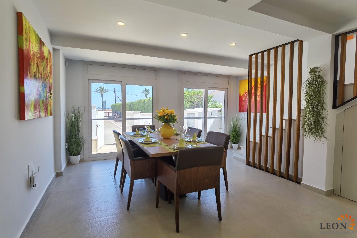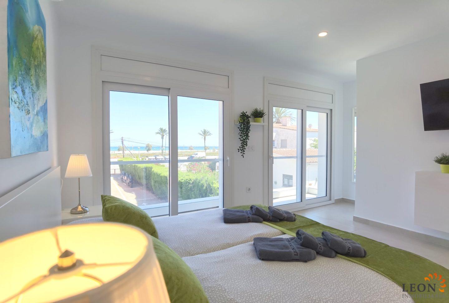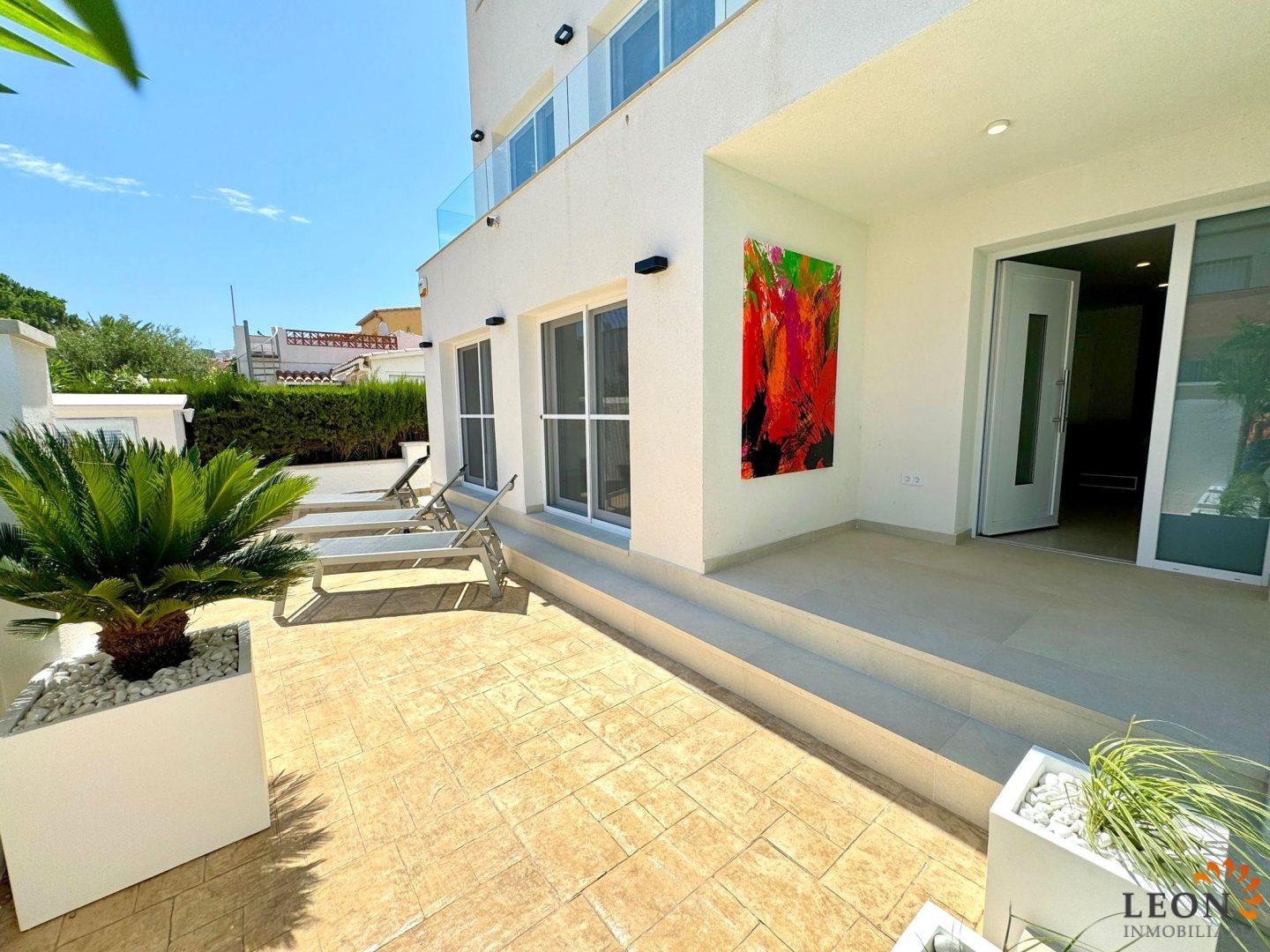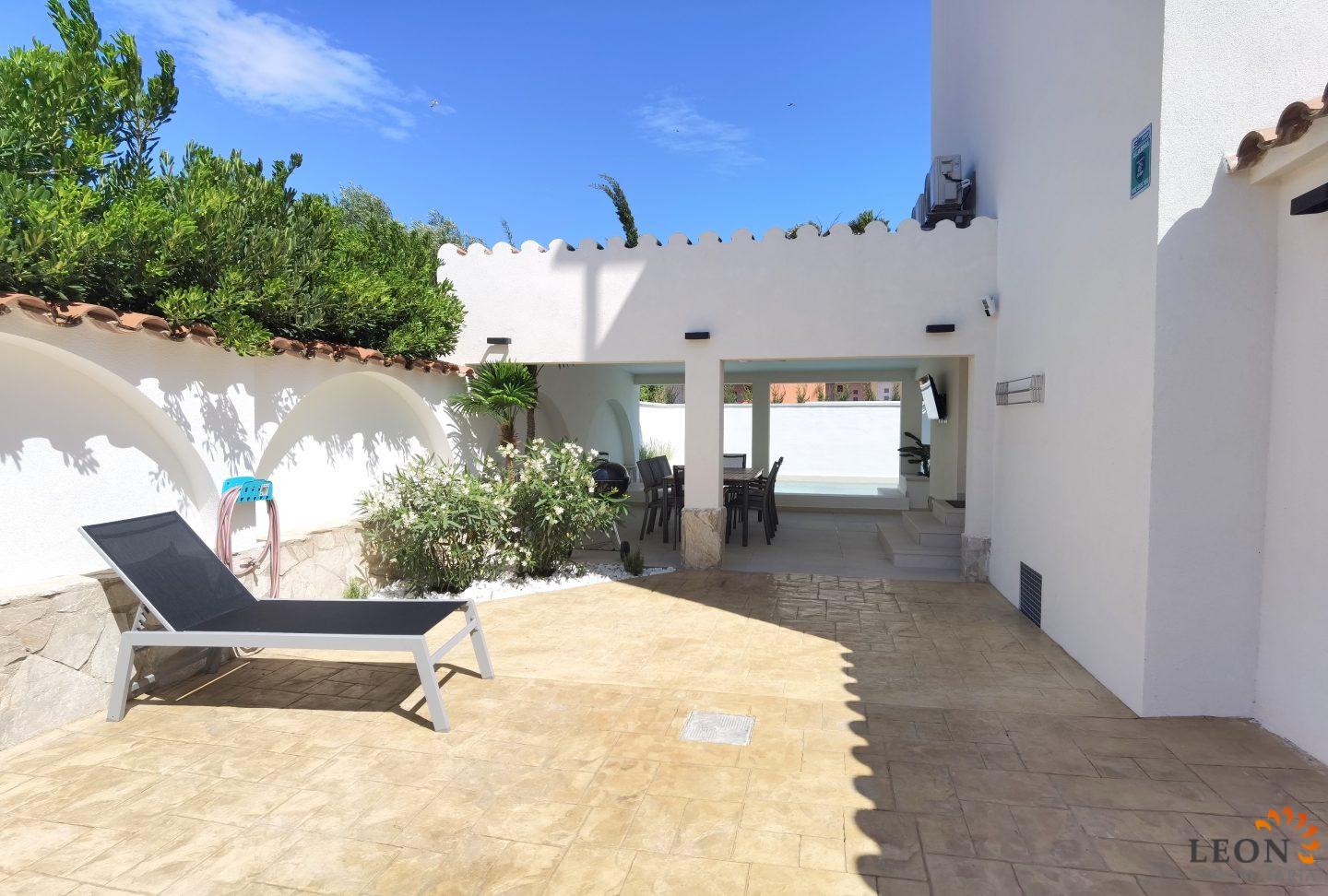 Luxurious beach villa for up to 8 people, 4 bedrooms, 3 bathrooms and a private pool. The villa is divided as follows: On the ground floor there is a spacious and bright living / dining room with access to the magnificent terrace with charcoal barbecue, private pool and sun loungers, an open and fully equipped kitchen, a guest toilet and a bedroom with en-suite bathroom (suite). The villa is decorated according to the colour concept of Feng Shui and makes you feel comfortable and relaxed while you can enjoy the sea views from all floors, the villa is south facing. On the first floor there are 3 double bedrooms with 2 bathrooms (shower). The top floor has a beautiful, spacious terrace overlooking the sea and Empuriabrava with sun loungers and a chill-out area to enjoy the warm evenings with a drink and good company. The house is equipped with reversible air conditioning (construction with thermal insulation), satellite TV (DE/FR/UK), a car park, a washing machine and a tumble dryer. The property is located in the center of Empuriabrava, all amenities are near, the beautiful golden sand beach of Empuriabrava, the restaurants, supermarkets, all within walking distance. Also the historic town of Castelló d'Empuries, Roses or the charming Küstendorf Cadaqués with its idyllic harbor are within easy reach by car. Empuriabrava and the surrounding area offer unlimited recreational opportunities like skydiving, all kinds of water sport activities and golf, as well as numerous cultural attractions such as the Dali museum in Figueres, the monastery of Sant Pere de Rodes and the Greek and Roman ruins of Ampurias. For further information about this property, or indeed other holiday properties, please contact LEON INMOBILIARIA by email or telephone at our main office in Empuriabrava: 0034 / 972 45 00 37.