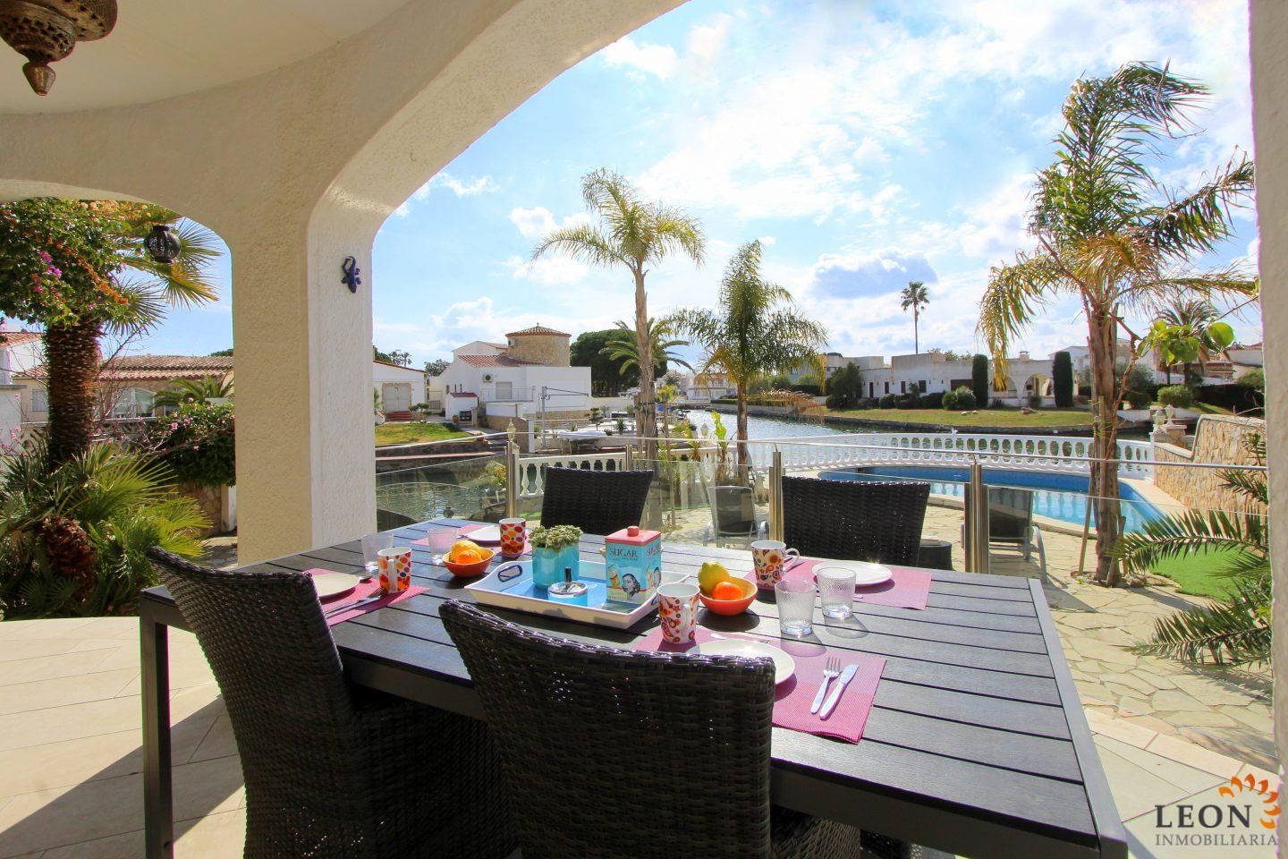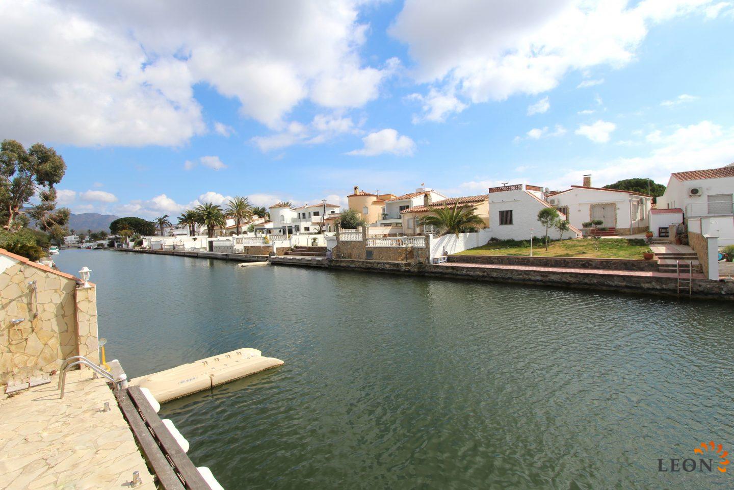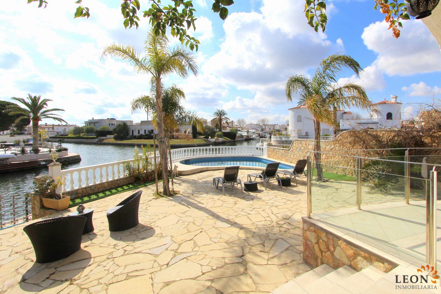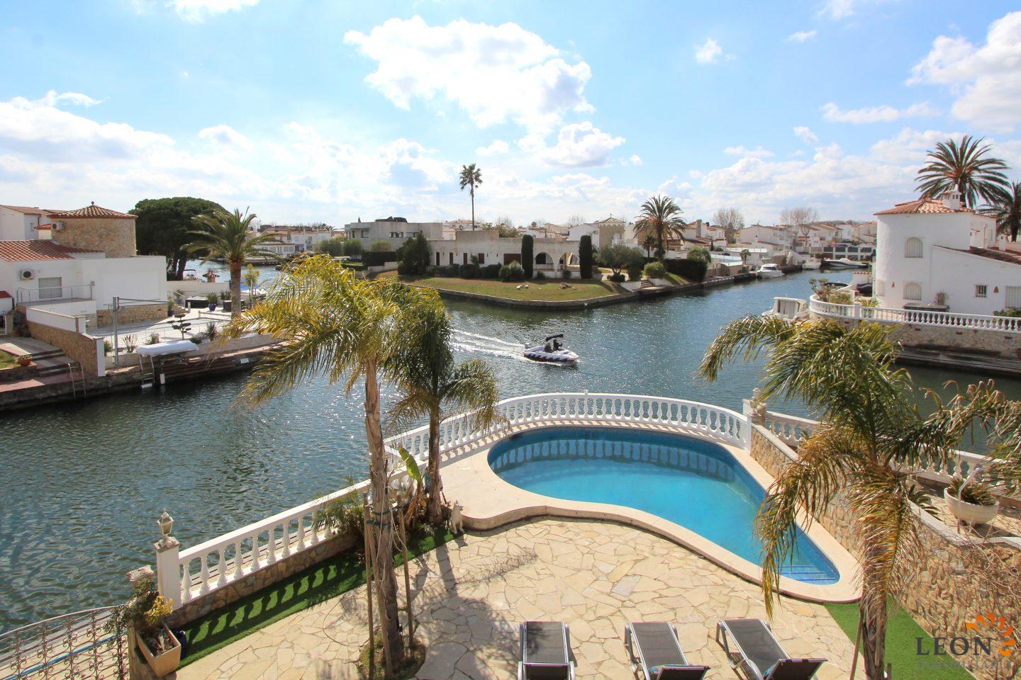 This beautiful villa is located near the entrance of Empuriabrava with a plot of 444 m2 and a living area of 171m2 and is divided as follows. On the ground floor there is a spacious and bright living area with access to the beautiful terrace with pool, 15 m jetty and a fantastic view over the canal, a well equipped separate kitchen, 1 bedroom with bathroom and a guest toilet. An outside staircase leads to the 1st floor, each bedroom with bathroom and separate entrance. Equipped with: Air conditioning, shutters, satellite TV. Outside there is a barbecue, an outdoor shower and a parking lot. Situated near the entrance of Empuriabrava, restaurants and shops are not far. The gorgeous sandy beach is a mere km away, whilst the beautiful beaches of Santa Margarita and Roses are easy and quick to reach by car. Additionally, Empuriabrava and the surrounding area offer unlimited recreational opportunities like skydiving, all kinds of water sport activities and golf, as well as a wide choice of cultural attractions such as the Dali museum in Figueres, the monastery of Sant Pere de Rodes and the Greek and Roman ruins of Ampurias. For further information about this property, or indeed other holiday properties, please contact LEON INMOBILIARIA by email or telephone at our main office in Empuriabrava: 0034 / 972 45 00 37.
