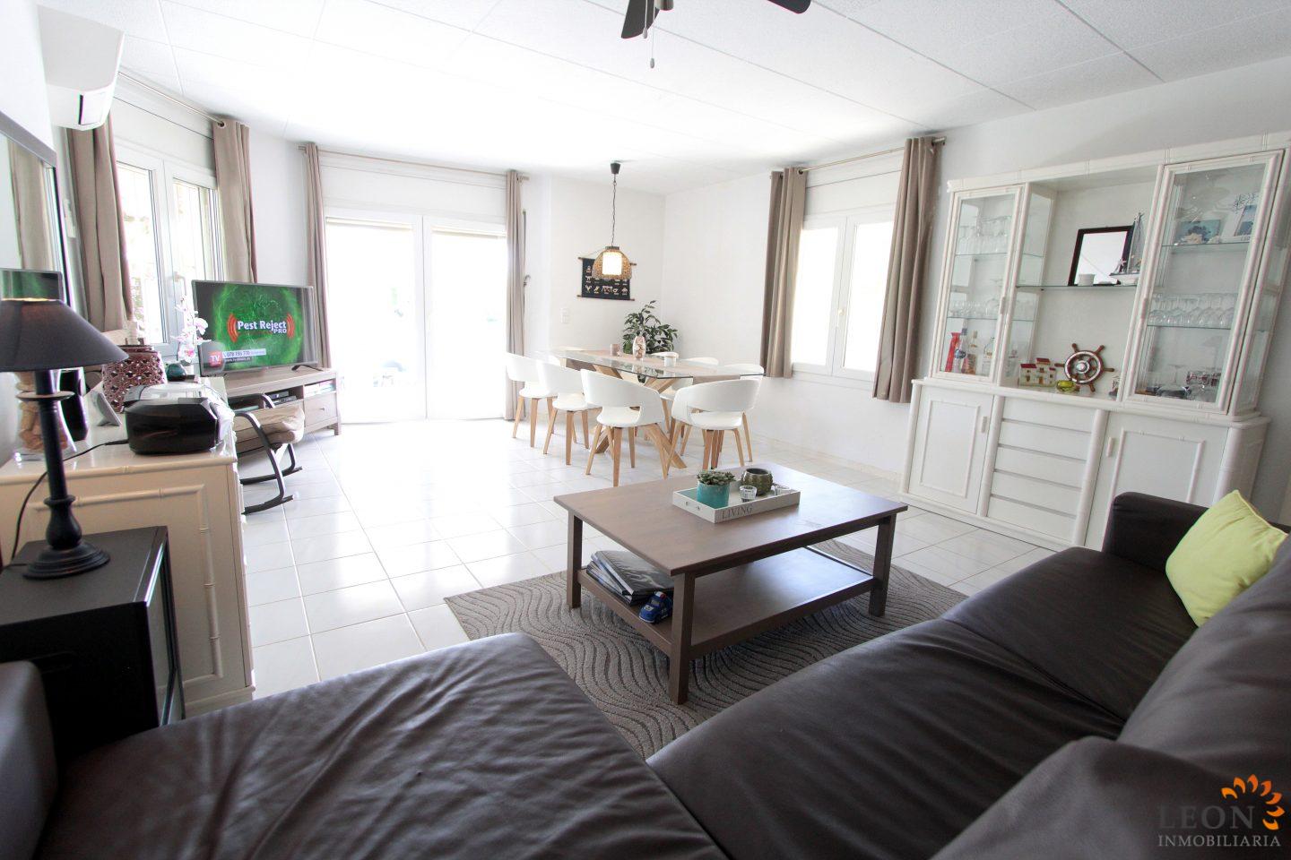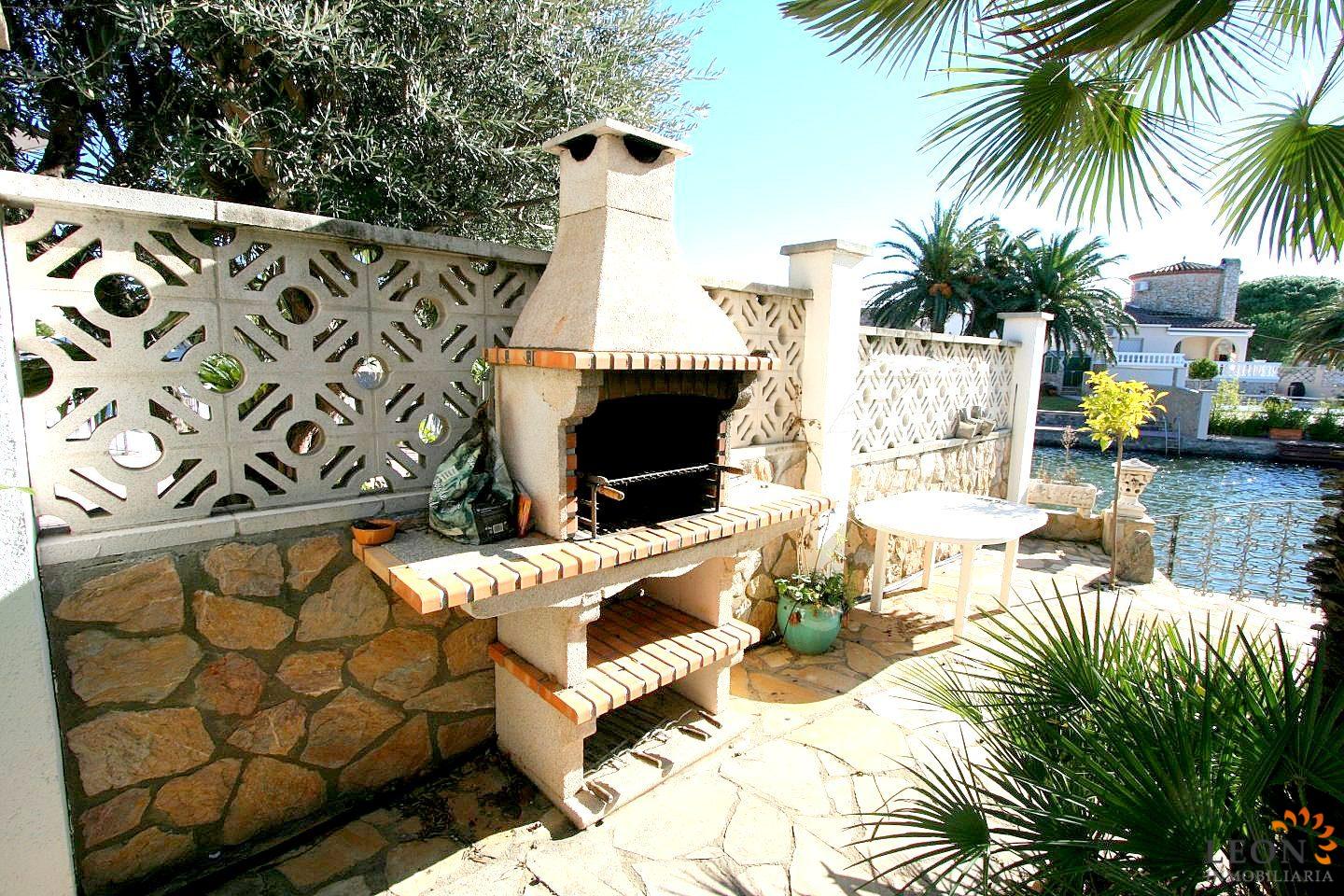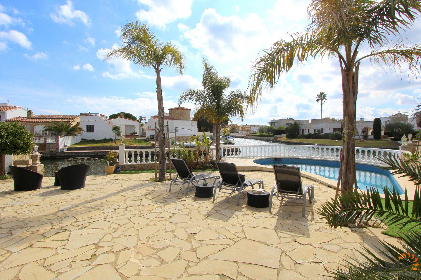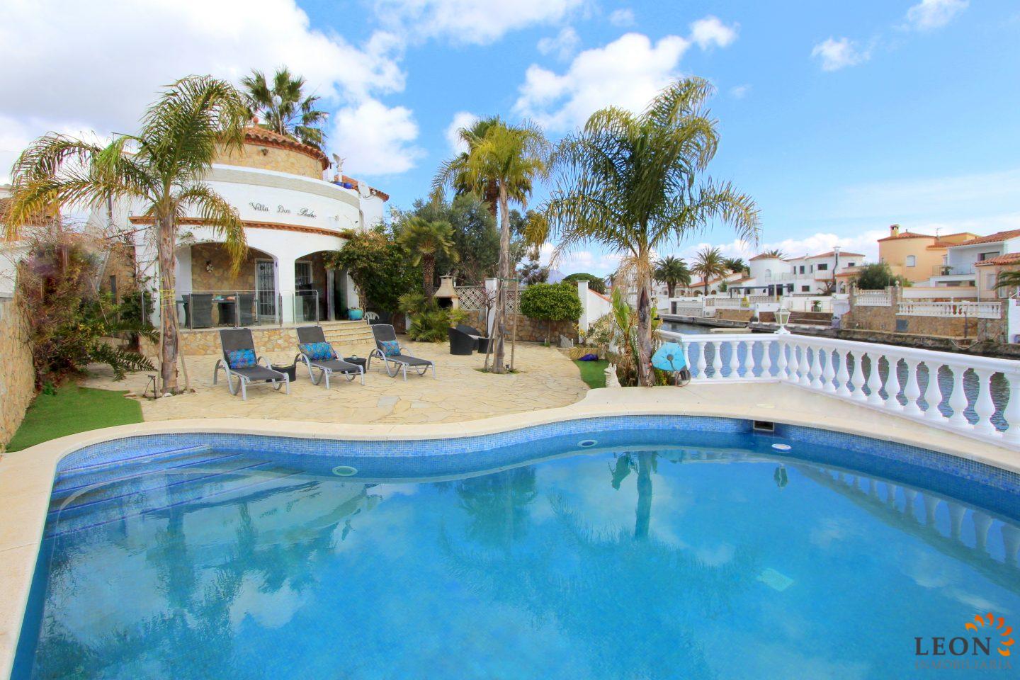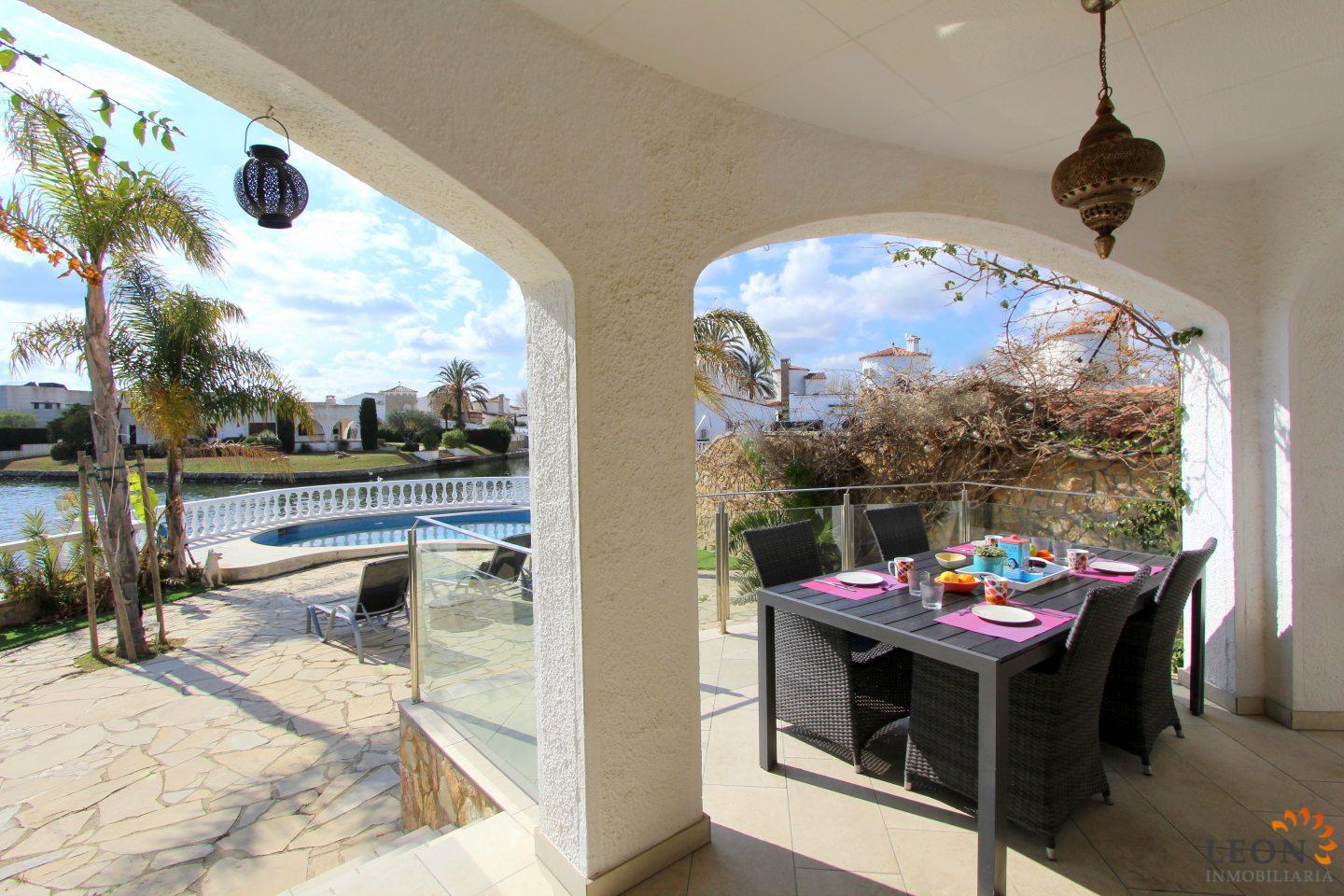 This beautiful villa is located near the entrance of Empuriabrava with a plot of 444 m2 and a living area of 171m2 and is divided as follows. On the ground floor there is a spacious and bright living area with access to the beautiful terrace with pool, 15 m jetty and a fantastic view over the canal, a well equipped separate kitchen, 1 bedroom with bathroom and a guest toilet. An outside staircase leads to the 1st floor, each bedroom with bathroom and separate entrance. Equipped with: Air conditioning, shutters, satellite TV. Outside there is a barbecue, an outdoor shower and a parking lot. Situated near the entrance of Empuriabrava, restaurants and shops are not far. The gorgeous sandy beach is a mere km away, whilst the beautiful beaches of Santa Margarita and Roses are easy and quick to reach by car. Additionally, Empuriabrava and the surrounding area offer unlimited recreational opportunities like skydiving, all kinds of water sport activities and golf, as well as a wide choice of cultural attractions such as the Dali museum in Figueres, the monastery of Sant Pere de Rodes and the Greek and Roman ruins of Ampurias. For further information about this property, or indeed other holiday properties, please contact LEON INMOBILIARIA by email or telephone at our main office in Empuriabrava: 0034 / 972 45 00 37.