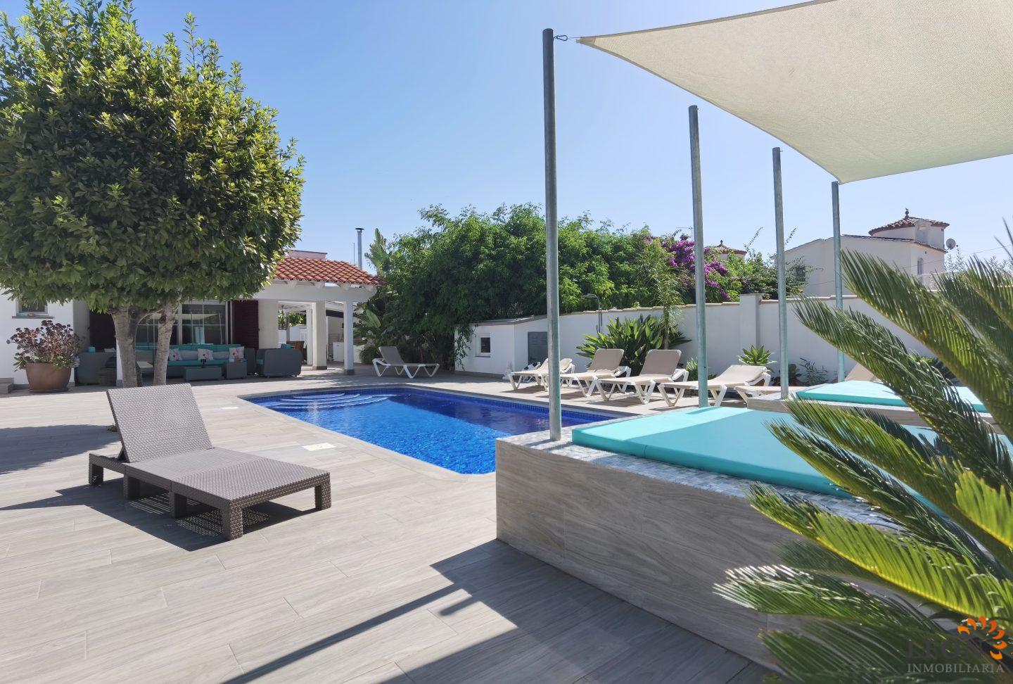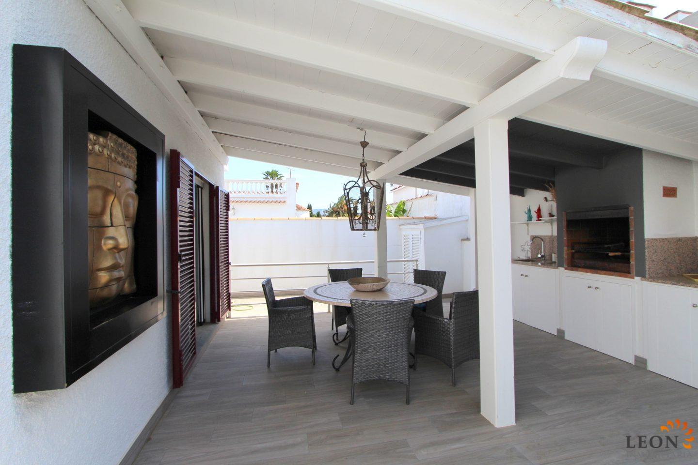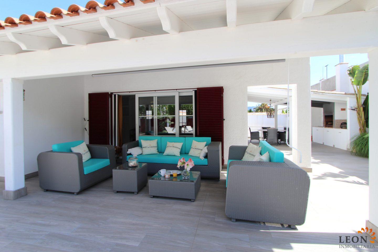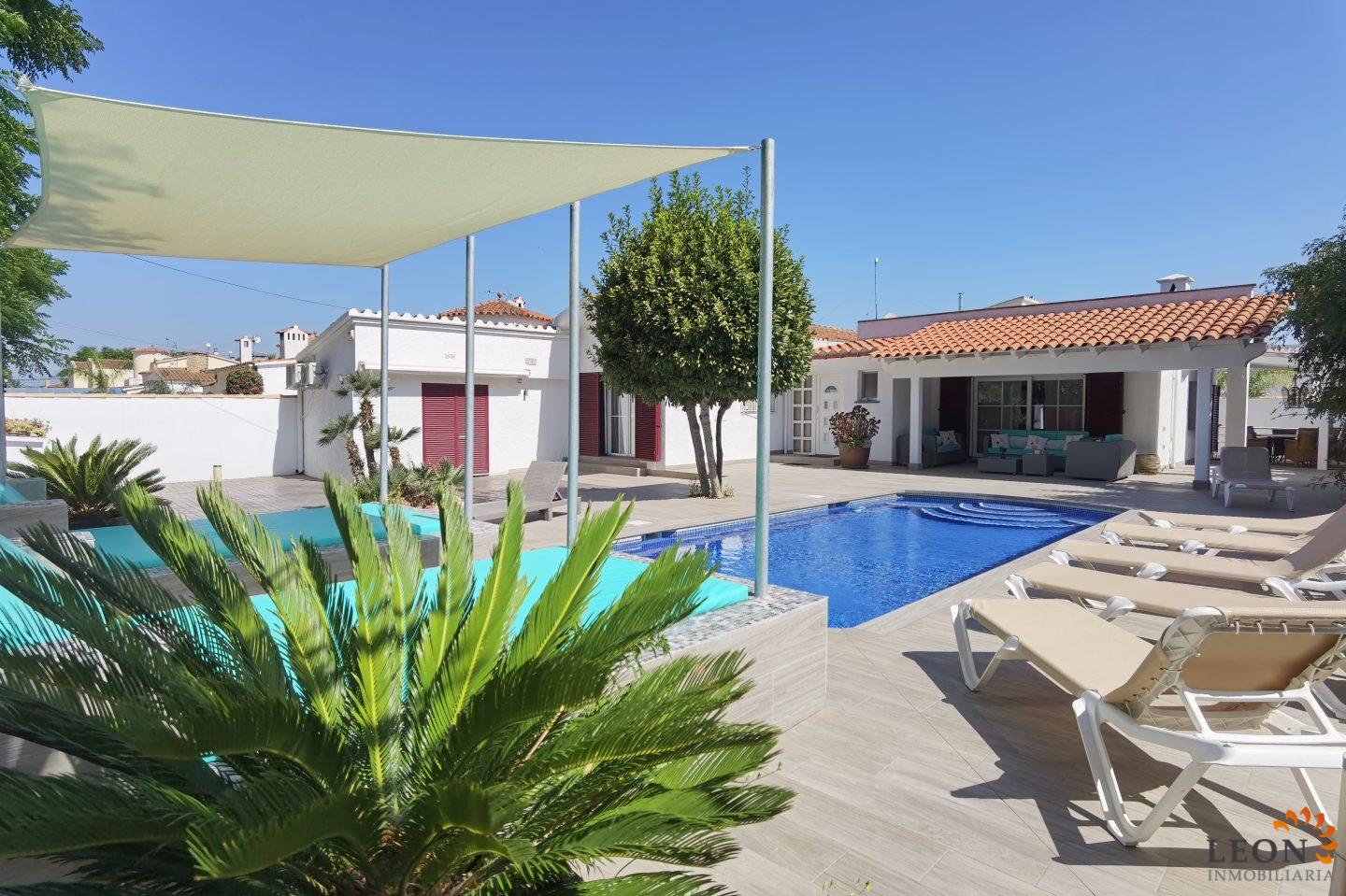Modern holiday villa in a quiet location with a plot of 600 m2 and a living area of 194 m2. A true holiday dream, all on one level, consisting of 3 double bedrooms, 3 bathrooms and a guest toilet. A comfortable and large living-dining room with a fully equipped open kitchen. From the living area you have access to the covered terrace with pool, where you can enjoy your holiday with the cosy barbecue area. This villa also has a guest flat with 1 bedroom, bathroom and a cosy living room with kitchen. The villa has all amenities such as air conditioning, central heating, washing machine, dishwasher, microwave, satellite TV (UK/DE/FR/ES), internet connection, garden lighting and parking. The property is close to supermarkets, restaurants, bars and only 1.5 km from the beach. Ideal for a relaxing holiday. Empuriabrava and its surroundings offer a wide range of activities such as parachute jumps, water sports and a variety of interesting cultural sites such as the Dali Museum in Figueres, the Monastery of San Perez de Rhodes and the Greek ruins of Empuria. For more information about this property or other holiday properties, please visit LEON INMOBILIARIA, by e-mail or phone to our central agency in Empuriabrava: 0034 / 972 45 00 37.