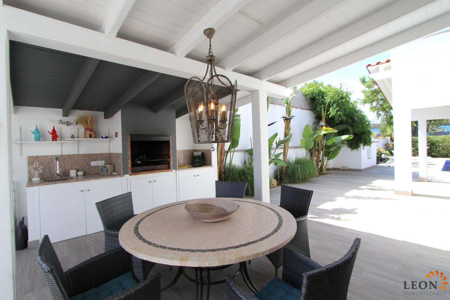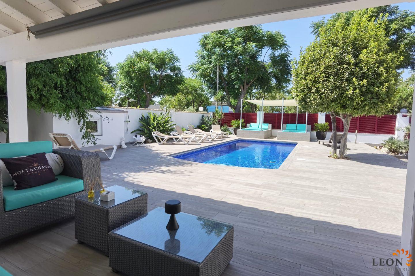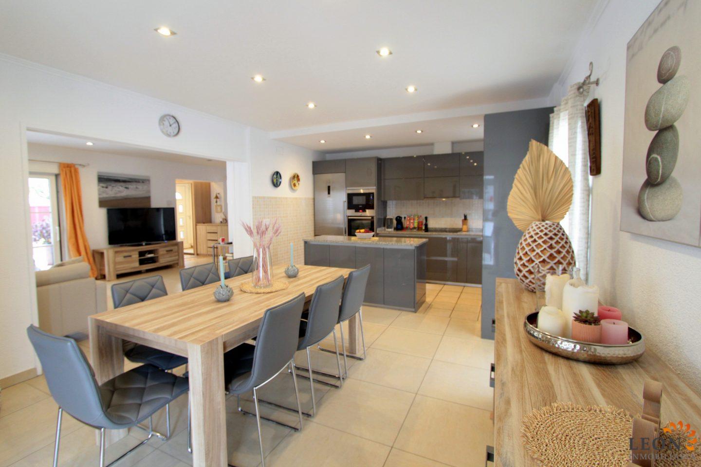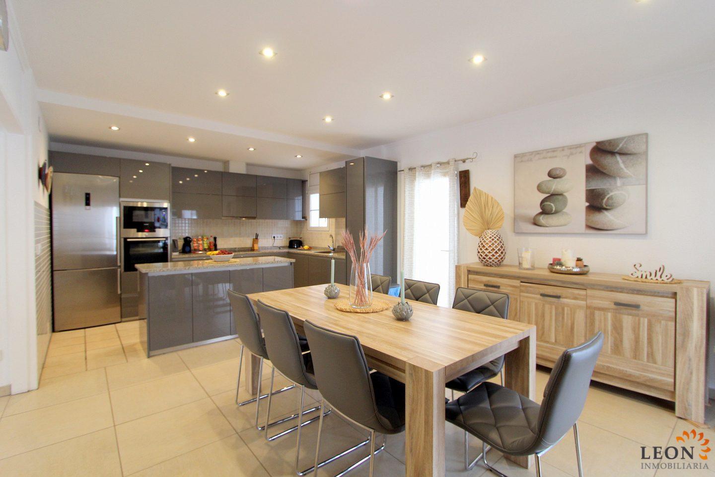 Modern holiday villa in a quiet location with a plot of 600 m2 and a living area of 194 m2. A true holiday dream, all on one level, consisting of 3 double bedrooms, 3 bathrooms and a guest toilet. A comfortable and large living-dining room with a fully equipped open kitchen. From the living area you have access to the covered terrace with pool, where you can enjoy your holiday with the cosy barbecue area. This villa also has a guest flat with 1 bedroom, bathroom and a cosy living room with kitchen. The villa has all amenities such as air conditioning, central heating, washing machine, dishwasher, microwave, satellite TV (UK/DE/FR/ES), internet connection, garden lighting and parking. The property is close to supermarkets, restaurants, bars and only 1.5 km from the beach. Ideal for a relaxing holiday. Empuriabrava and its surroundings offer a wide range of activities such as parachute jumps, water sports and a variety of interesting cultural sites such as the Dali Museum in Figueres, the Monastery of San Perez de Rhodes and the Greek ruins of Empuria. For more information about this property or other holiday properties, please visit LEON INMOBILIARIA, by e-mail or phone to our central agency in Empuriabrava: 0034 / 972 45 00 37.