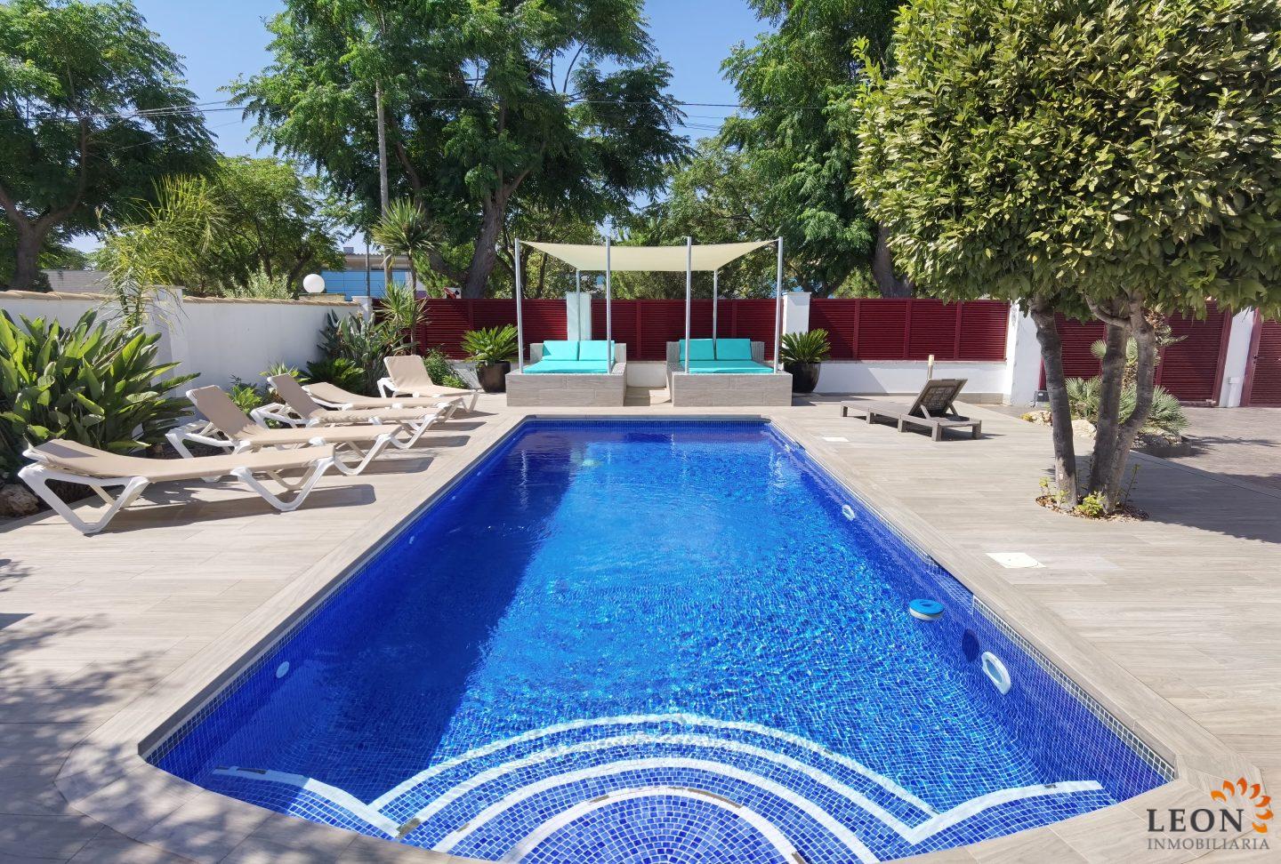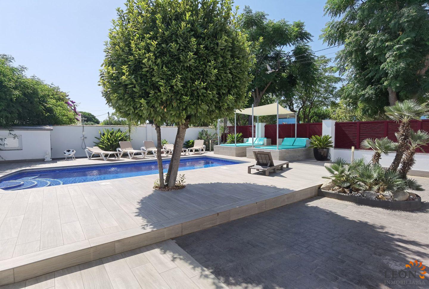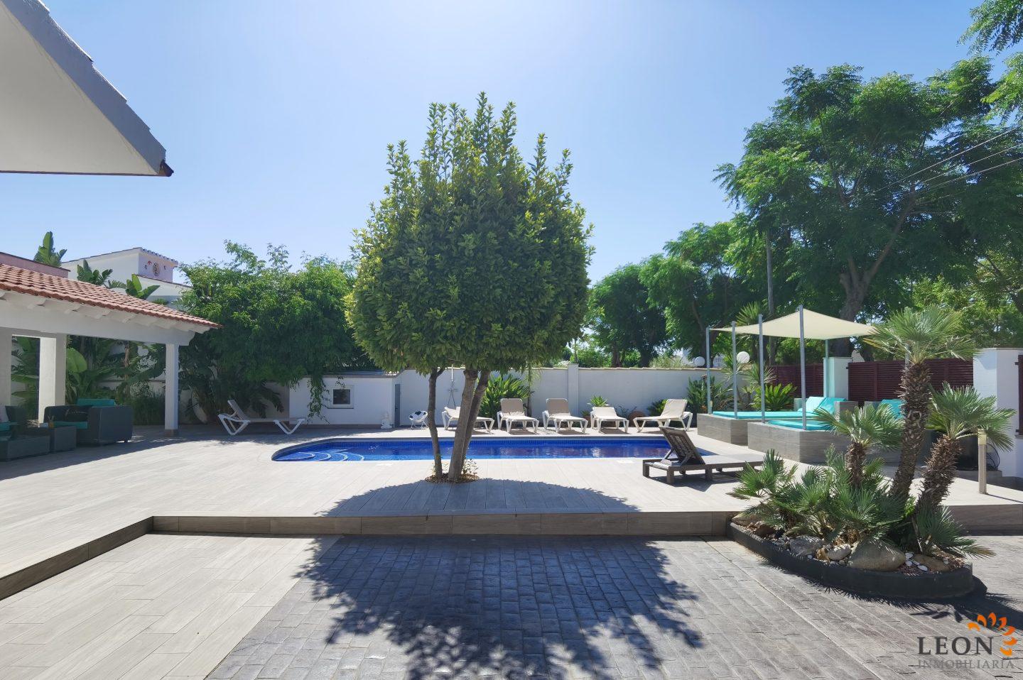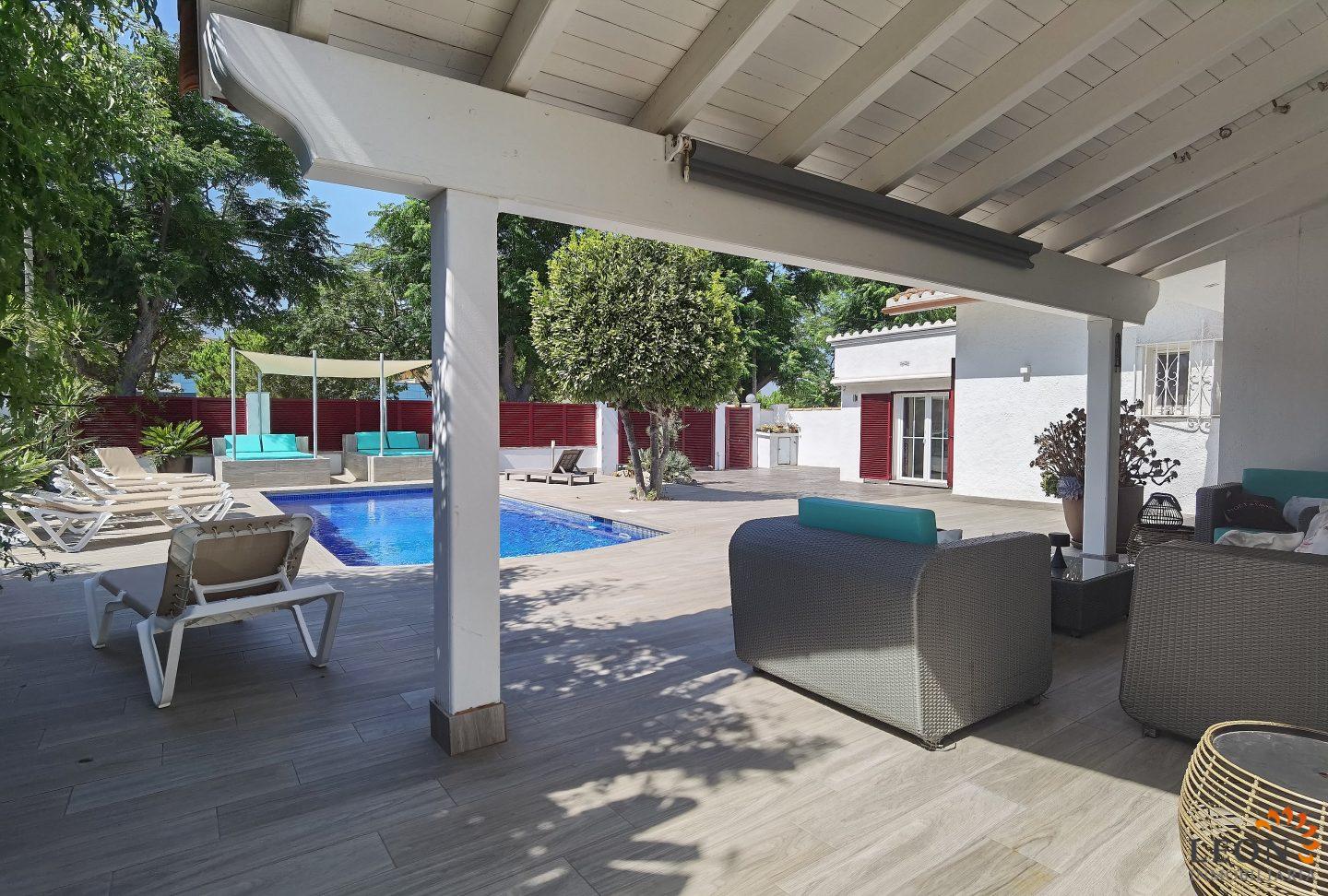 Modern holiday villa in a quiet location with a plot of 600 m2 and a living area of 194 m2. A true holiday dream, all on one level, consisting of 3 double bedrooms, 3 bathrooms and a guest toilet. A comfortable and large living-dining room with a fully equipped open kitchen. From the living area you have access to the covered terrace with pool, where you can enjoy your holiday with the cosy barbecue area. This villa also has a guest flat with 1 bedroom, bathroom and a cosy living room with kitchen. The villa has all amenities such as air conditioning, central heating, washing machine, dishwasher, microwave, satellite TV (UK/DE/FR/ES), internet connection, garden lighting and parking. The property is close to supermarkets, restaurants, bars and only 1.5 km from the beach. Ideal for a relaxing holiday. Empuriabrava and its surroundings offer a wide range of activities such as parachute jumps, water sports and a variety of interesting cultural sites such as the Dali Museum in Figueres, the Monastery of San Perez de Rhodes and the Greek ruins of Empuria. For more information about this property or other holiday properties, please visit LEON INMOBILIARIA, by e-mail or phone to our central agency in Empuriabrava: 0034 / 972 45 00 37.