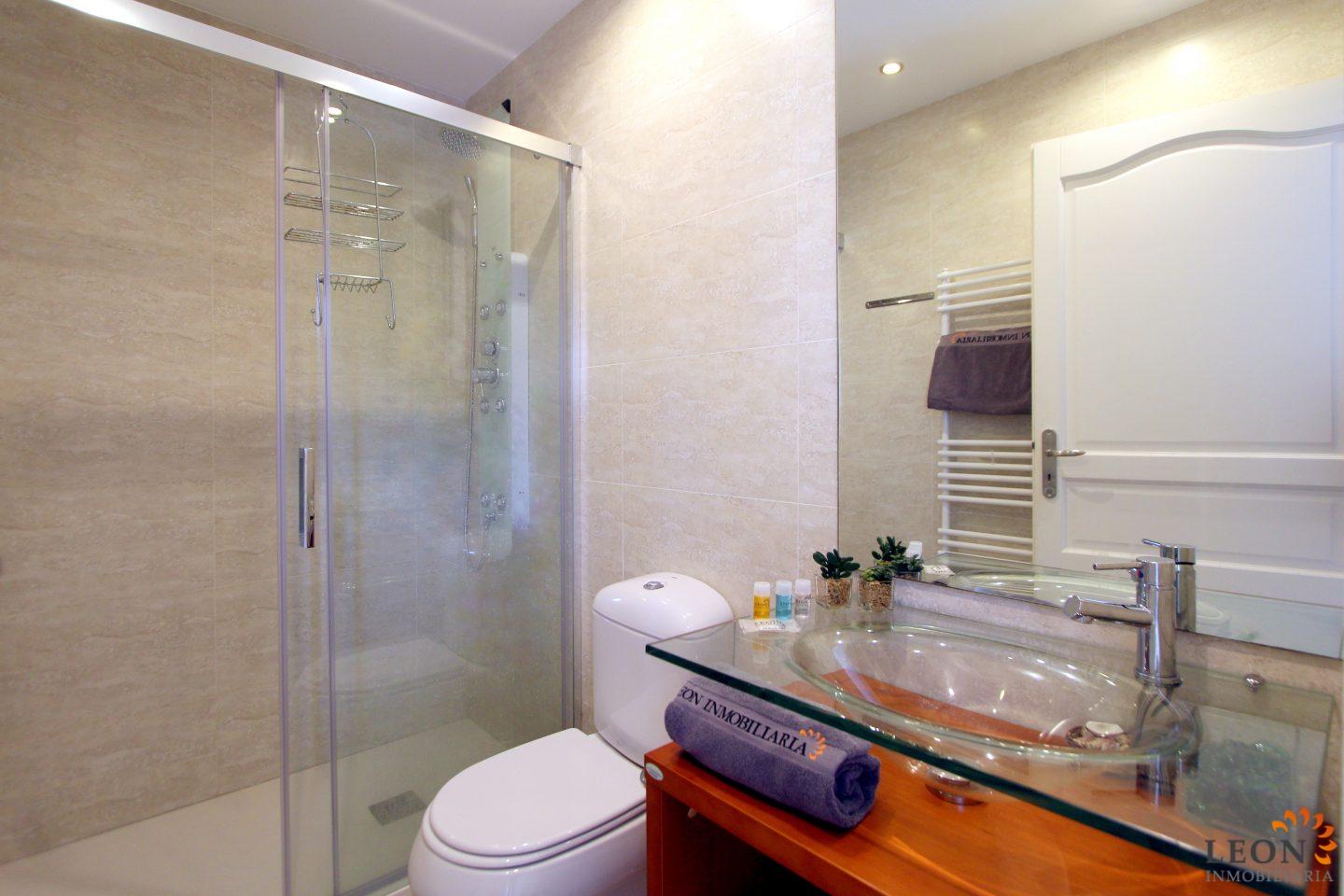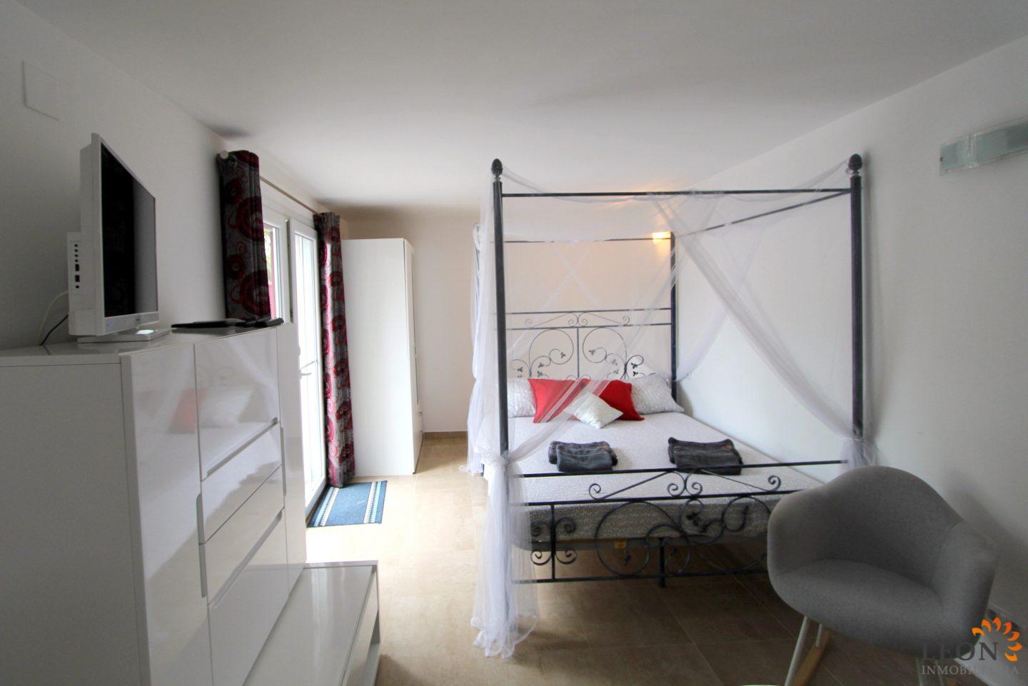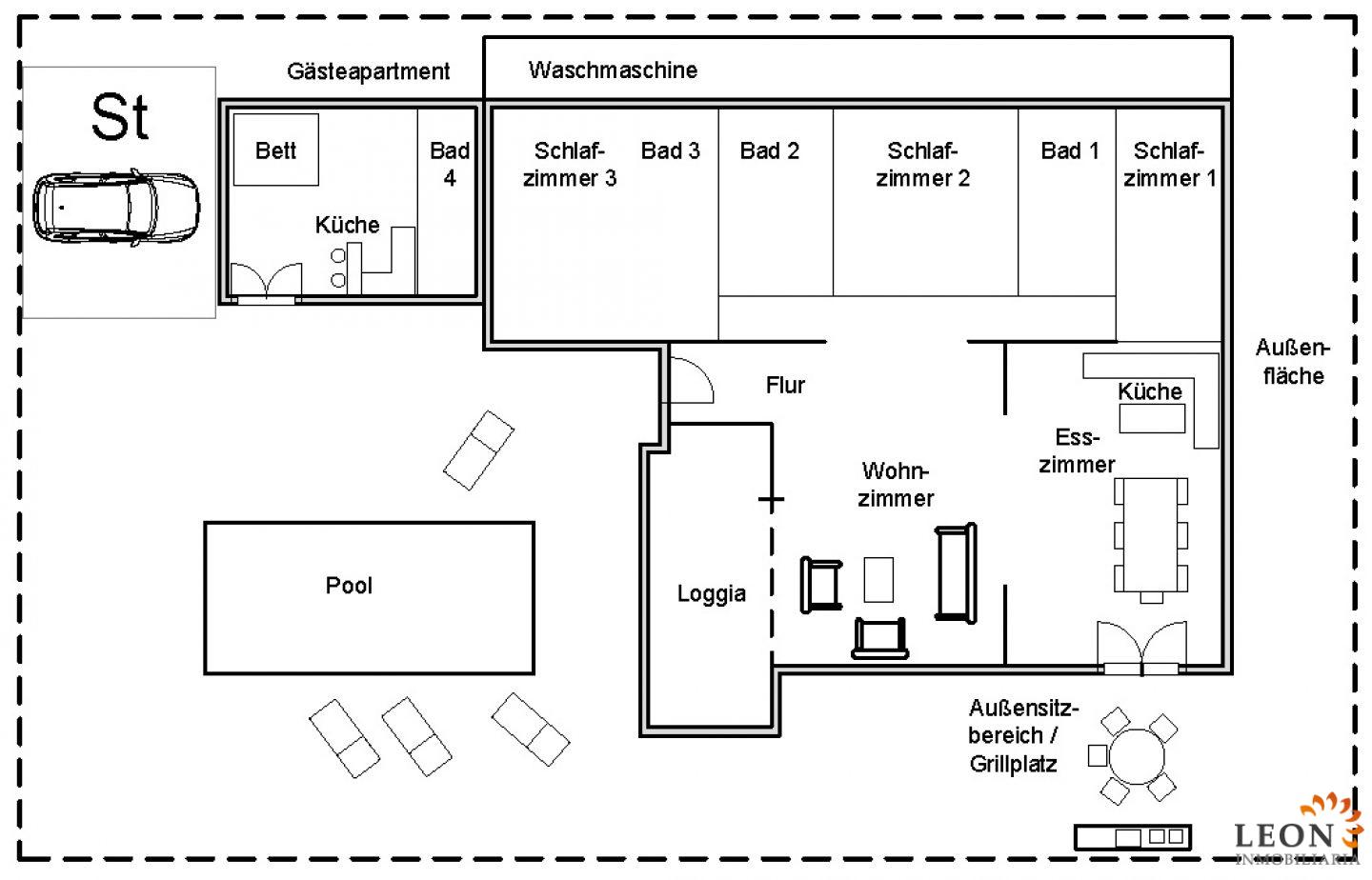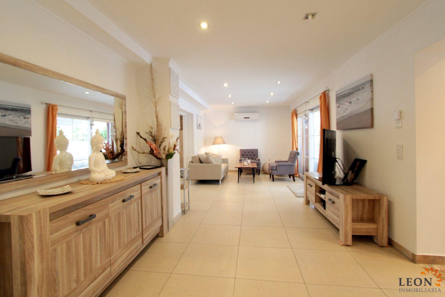 Modern holiday villa in a quiet location with a plot of 600 m2 and a living area of 194 m2. A true holiday dream, all on one level, consisting of 3 double bedrooms, 3 bathrooms and a guest toilet. A comfortable and large living-dining room with a fully equipped open kitchen. From the living area you have access to the covered terrace with pool, where you can enjoy your holiday with the cosy barbecue area. This villa also has a guest flat with 1 bedroom, bathroom and a cosy living room with kitchen. The villa has all amenities such as air conditioning, central heating, washing machine, dishwasher, microwave, satellite TV (UK/DE/FR/ES), internet connection, garden lighting and parking. The property is close to supermarkets, restaurants, bars and only 1.5 km from the beach. Ideal for a relaxing holiday. Empuriabrava and its surroundings offer a wide range of activities such as parachute jumps, water sports and a variety of interesting cultural sites such as the Dali Museum in Figueres, the Monastery of San Perez de Rhodes and the Greek ruins of Empuria. For more information about this property or other holiday properties, please visit LEON INMOBILIARIA, by e-mail or phone to our central agency in Empuriabrava: 0034 / 972 45 00 37.