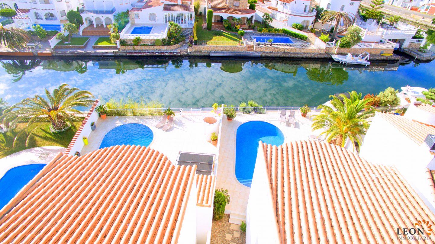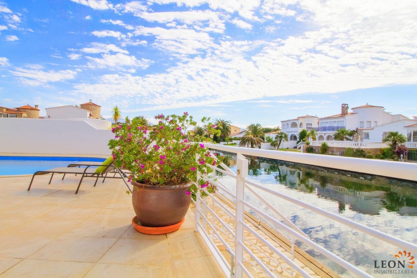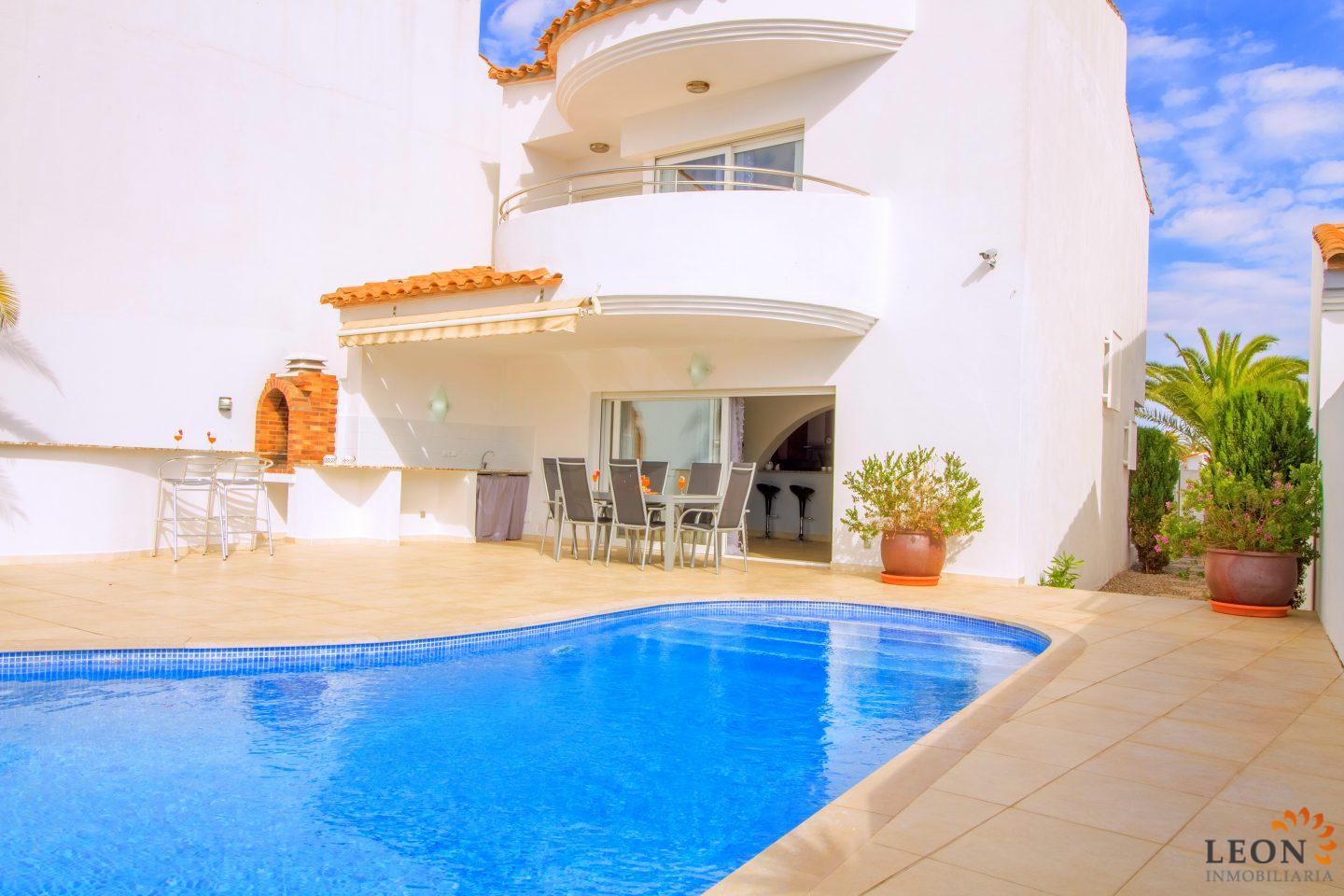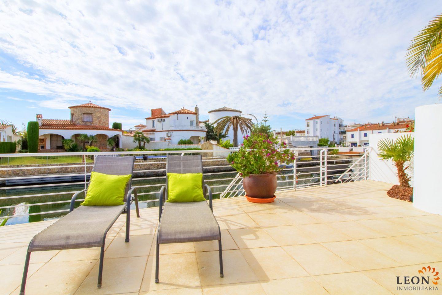 Dit elegante vakantiehuis heeft een royale woonruimte verdeeld over twee verdiepingen. Buiten staan de zacht vloeiende lijnen van de villa, die herhaald worden in de vorm van het zwembad en de buitendouche, in scherp contrast met het briljante wit van het gebouw zelf, terwijl binnen de architectuur modern, strak en elegant is. Naast 3 slaapkamers en 2 badkamers heeft deze ideale villa een mooie ruime woon-/eetkamer met een volledig ingerichte open keuken. Kenmerken zijn omkeerbare airconditioning in de woonkamer en in alle slaapkamers, een groot terras met zwembad en prachtig uitzicht op de gracht, evenals parkeergelegenheid op de binnenplaats. Vanwege de ligging van de villa dicht bij het centrum van Empuriabrava bevinden zich de restaurants, winkels en het fijn zandige strand op loopafstand. De prachtige stranden van Santa Margarita en Roses zijn gemakkelijk en snel met de auto te bereiken. Een ruime keuze aan culturele attracties is binnen een half uur te bereiken, zoals het Dali museum in Figueres, de ruïnes van Ampurias en het klooster van Sant Pere de Rodes. Het nabij liggende Peralada, waar enkele van de beste wijnen uit de omgeving worden gemaakt, organiseert het jaarlijkse internationale muziekfestival en heeft een 18-hole golfbaan met pitch & putt faciliteiten. Voor meer informatie over deze object, of een andere vakantiewoning kunt u contact opnemen met LEON INMOBILIARIA per email of telefonisch op ons hoofdkantoor in Empuriabrava: 0034 / 972 45 00 37.