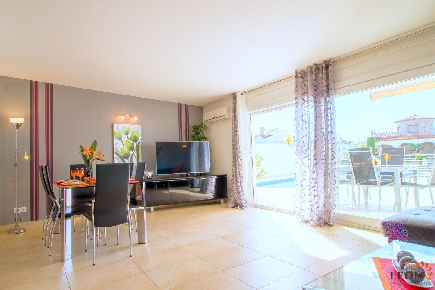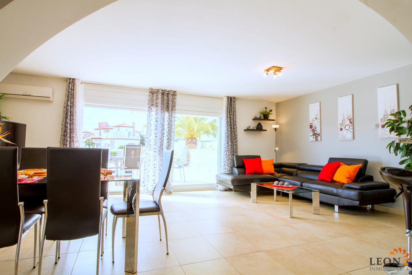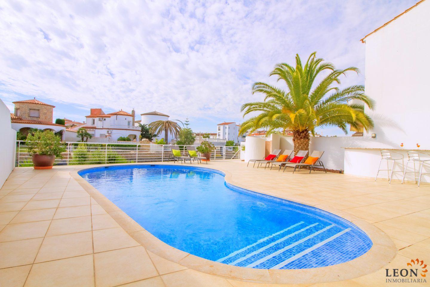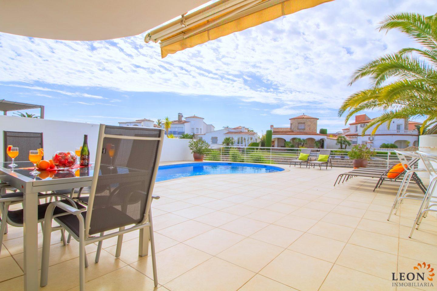 Dit elegante vakantiehuis heeft een royale woonruimte verdeeld over twee verdiepingen. Buiten staan de zacht vloeiende lijnen van de villa, die herhaald worden in de vorm van het zwembad en de buitendouche, in scherp contrast met het briljante wit van het gebouw zelf, terwijl binnen de architectuur modern, strak en elegant is. Naast 3 slaapkamers en 2 badkamers heeft deze ideale villa een mooie ruime woon-/eetkamer met een volledig ingerichte open keuken. Kenmerken zijn omkeerbare airconditioning in de woonkamer en in alle slaapkamers, een groot terras met zwembad en prachtig uitzicht op de gracht, evenals parkeergelegenheid op de binnenplaats. Vanwege de ligging van de villa dicht bij het centrum van Empuriabrava bevinden zich de restaurants, winkels en het fijn zandige strand op loopafstand. De prachtige stranden van Santa Margarita en Roses zijn gemakkelijk en snel met de auto te bereiken. Een ruime keuze aan culturele attracties is binnen een half uur te bereiken, zoals het Dali museum in Figueres, de ruïnes van Ampurias en het klooster van Sant Pere de Rodes. Het nabij liggende Peralada, waar enkele van de beste wijnen uit de omgeving worden gemaakt, organiseert het jaarlijkse internationale muziekfestival en heeft een 18-hole golfbaan met pitch & putt faciliteiten. Voor meer informatie over deze object, of een andere vakantiewoning kunt u contact opnemen met LEON INMOBILIARIA per email of telefonisch op ons hoofdkantoor in Empuriabrava: 0034 / 972 45 00 37.