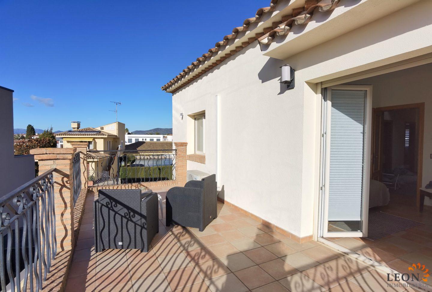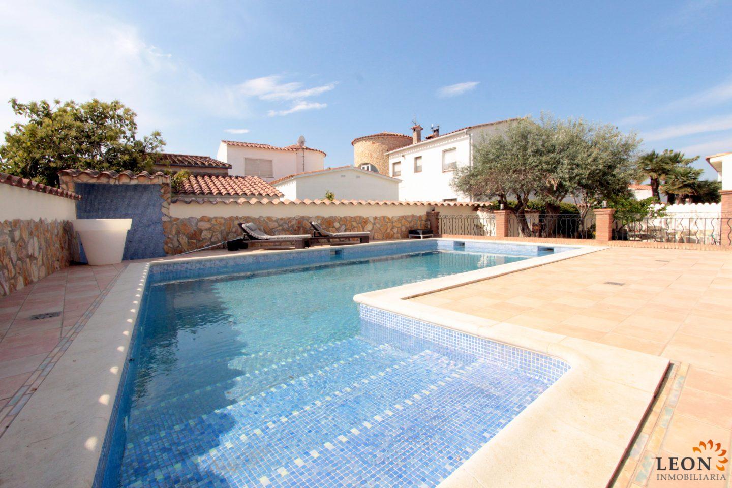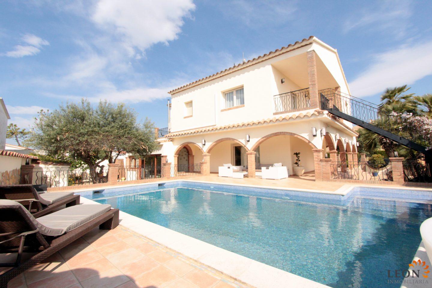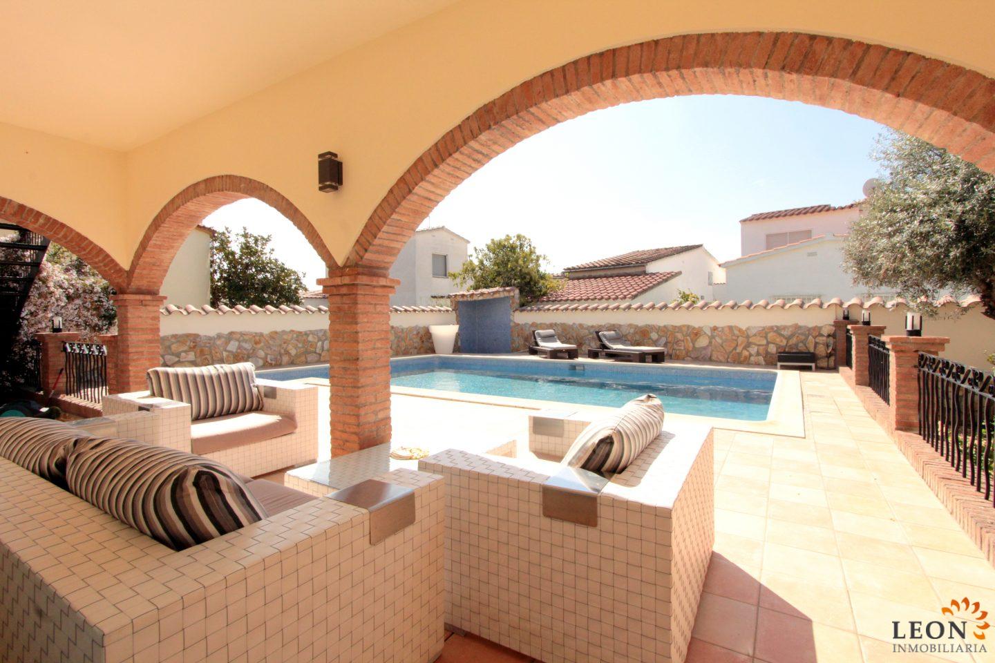 Elegant holiday villa with a comfortable living/dining room area and an open plan fully equipped kitchen, a guest toilet, from the living room you have access to the beautiful terrace with pool and garden, small garage (not suitable for cars). A pleasant internal staircase leads to the 1st floor where there are 4 bedrooms, 3 bedrooms, 1 bathroom and the 4th bedroom with a double bed and a French bed is en suite (with its own bathroom). A real holiday dream with all amenities such as; air conditioning, washing machine, dishwasher, microwave, SAT-TV (UK/DE/FR/ES), central heating and parking for 2 cars (enclosed property). Empuriabrava is considered one of the most beautiful places and famous for its port, not only on the Costa Brava, but also throughout Spain. ¨Pequeña Venecia¨ is the most important residential marina in Europe, with some 24 km of navigable channels. Empuriabrava is located 20 km from France and 140 km from Barcelona. This is a very popular tourist area, characterized by a mild climate, a developed infrastructure, ports, hotels, restaurants, etc. Every year, hundreds of thousands of tourists from all over the world come to the city. In a radius of 100 km from Empuriabrava are the places of historical and cultural interest of the region. 125 monuments of medieval architecture. For more information about this property or about other holiday properties, please visit LEON INMOBILIARIA, by email, or by phone to our central agency in Empuriabrava: 0034/972 45 00 37.